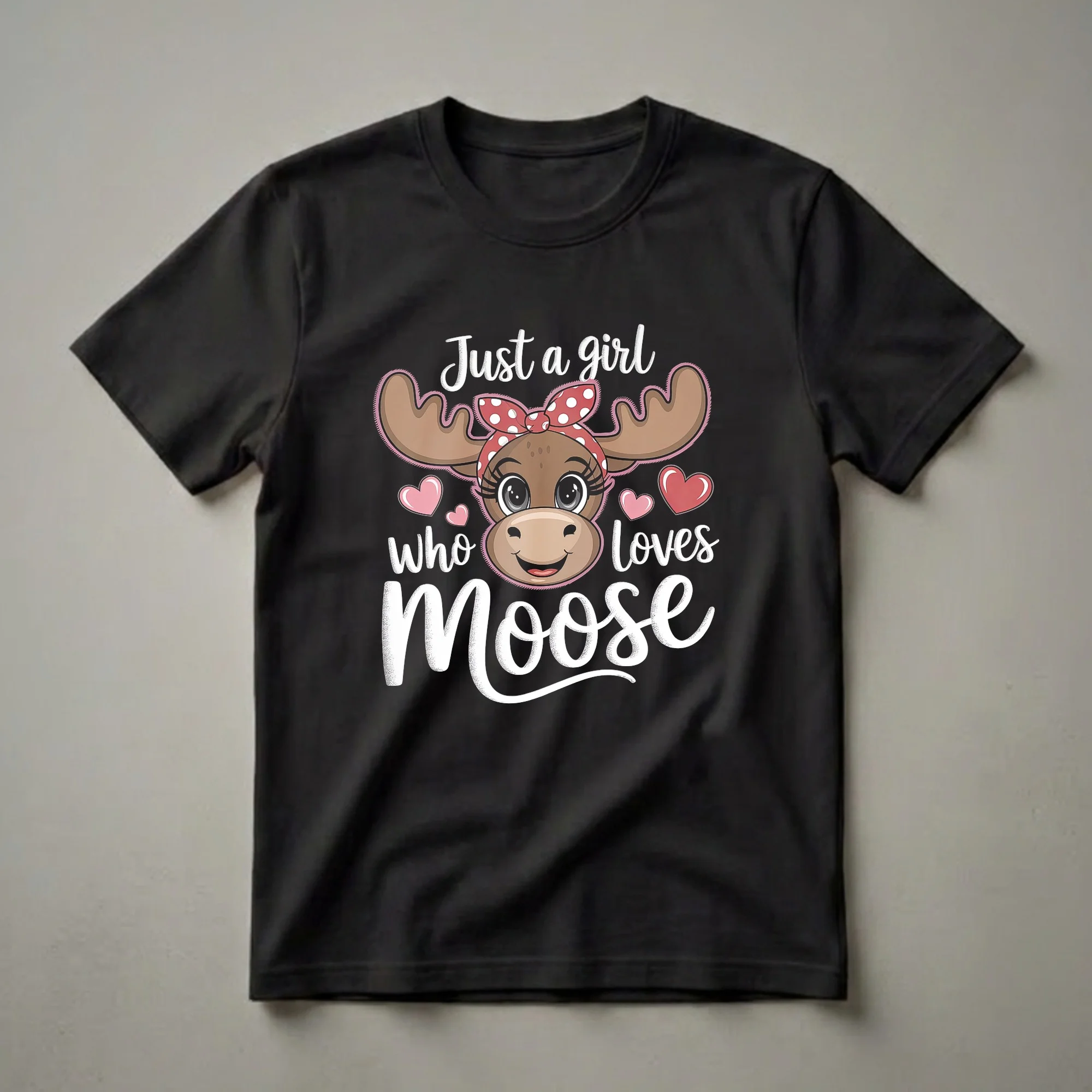 Girls and women who adore moose will reach for this charming graphic tee. The design features a stylized, cartoon moose with large, expressive eyes, wearing a red and white polka dot bandana and adorned with pink hearts. Bold white lettering proclaims, "Just a girl who loves Moose." This t-shirt is a delightful way for any admirer of these magnificent animals to express their passion. Moose, the largest members of the deer family, are native to the northern forests of North America and Eurasia, often found near lakes and rivers. This shirt makes a thoughtful gift for any girl or woman who appreciates wildlife and enjoys the beauty of the natural world. Wear it on a hike, to a casual outing, or simply while relaxing at home, showcasing your unique affection for these gentle giants of the forest. It's a staple in the collection for any moose enthusiast who cherishes the wild.