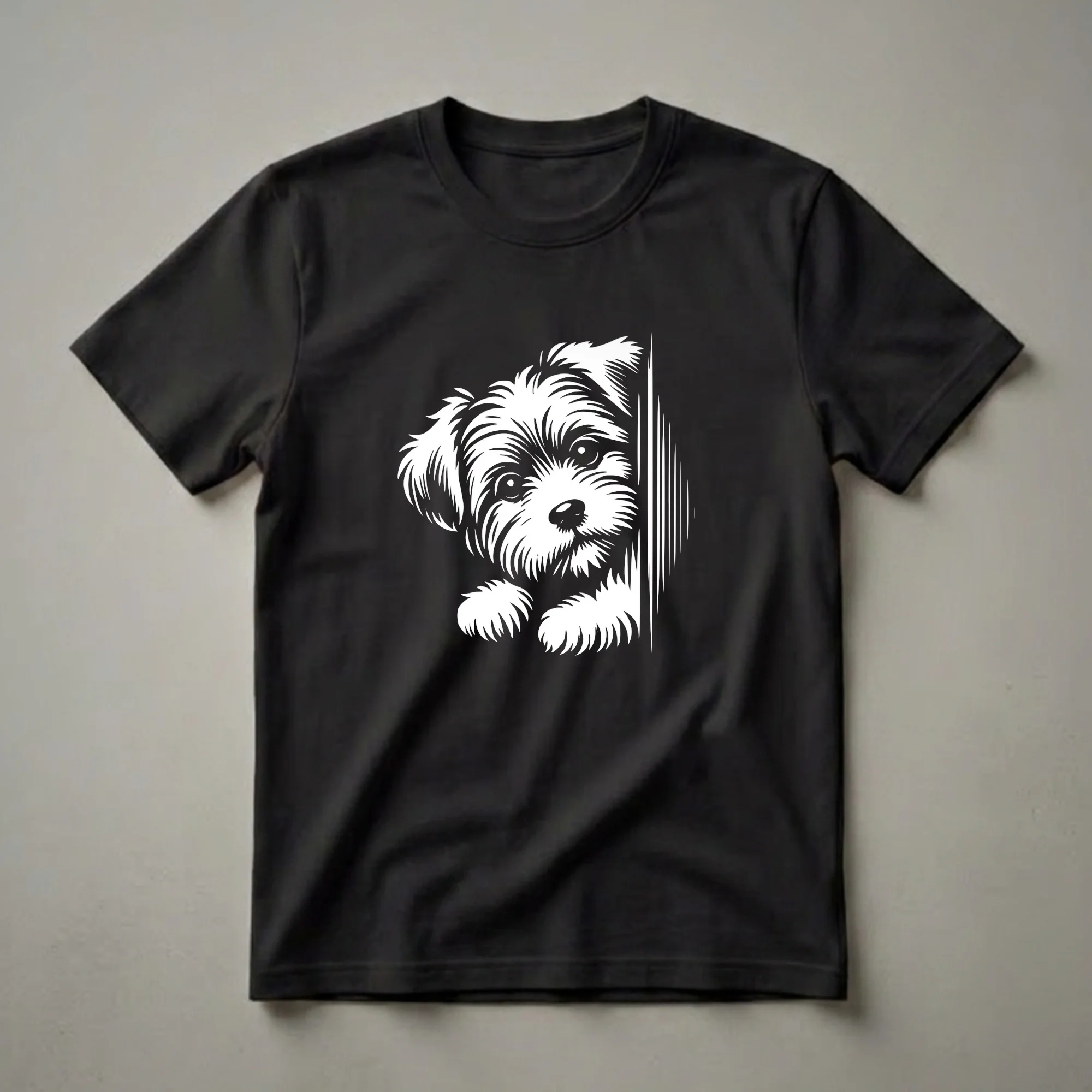 Showcasing a precious Morkie peeking around a corner, this graphic tee captures the endearing spirit of your favorite canine companion. This eye-catching graphic tee features a charming Morkie puppy peeking around a corner, its curious eyes and fluffy fur rendered in a striking white on black design. Morkies, a crossbreed between a Maltese and a Yorkshire Terrier, are known for their affectionate nature and playful personalities, making them a beloved companion. This t-shirt is a wonderful way for any Morkie mom or dad to express their devotion to their furry friend. It's a go-to tee for anyone who cherishes their canine companion. This shirt works well for casual outings, dog park visits, or simply relaxing at home with your pup. Looking for a thoughtful gift for the Morkie enthusiast in your life? This unique graphic shirt is sure to bring a smile to their face, celebrating the special bond between humans and their dogs. Wear it to show off your pride in your adorable Morkie.