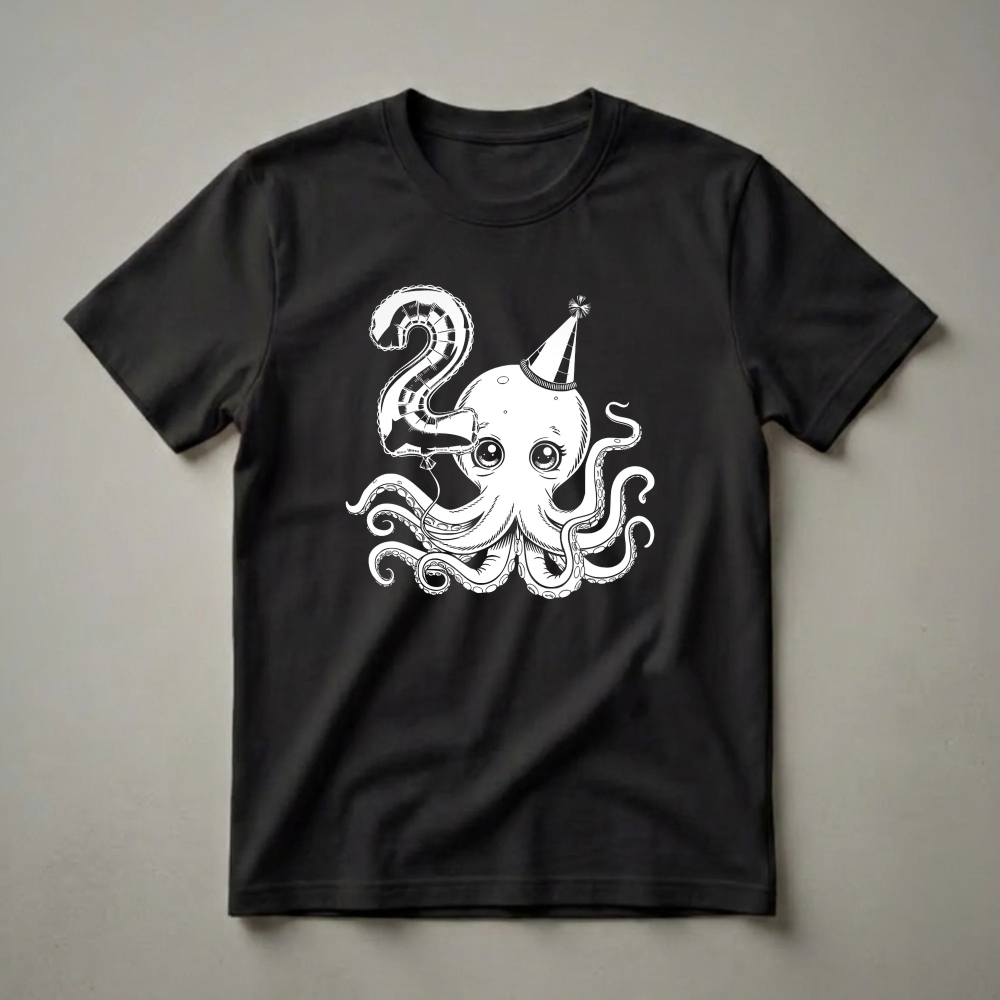 Two-year-olds are exploring the world with boundless energy, and this charming octopus tee is ready for all their adventures. The design showcases a whimsical octopus, complete with large, expressive eyes and a festive party hat perched jauntily on its head. It clutches a large balloon shaped like the number '2', symbolizing this special birthday milestone. Octopuses, known for their intelligence and adaptability, inhabit diverse marine environments across the globe, from shallow coral reefs to the deep sea. This graphic tee is a delightful way for a child turning two to express their personality. It makes a thoughtful gift for any toddler celebrating their second birthday, whether they are fascinated by sea creatures or simply love fun, colorful designs. This shirt is a thoughtful choice for birthday parties, playdates, or just a day of fun. Imagine your little one wearing this eye-catching t-shirt as they blow out their candles or open presents, creating memorable moments.