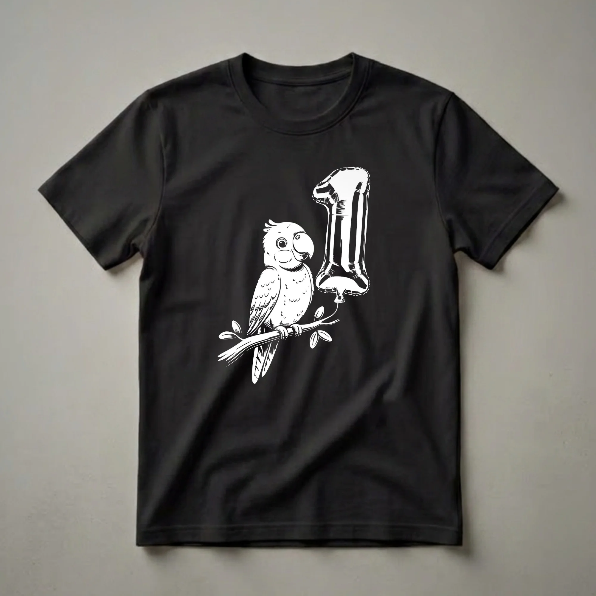 Celebrate any little one's special first birthday with this adorable graphic t-shirt featuring a charming parrot and a festive number one balloon. The design features a delightful white line art illustration of a friendly parrot perched on a branch, looking towards a shiny, inflated balloon shaped like the number '1'. Parrots, known for their intelligence and vibrant personalities, are often kept as companion birds, with species like the cockatoo, depicted here with its crest, being popular choices. This shirt is a wonderful way for parents, grandparents, or aunts to commemorate a special child's first year. It's a thoughtful gift idea for any toddler who is reaching this significant age. Imagine the birthday photos with your little one wearing this eye-catching t-shirt, ready to explore the world. This tee is a perfect addition to a birthday outfit, making the celebration even more memorable. It's a sweet reminder of a special day for any child turning one.