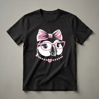 - Features a stylized puffin wearing pink glasses, a bow, and a pearl necklace.