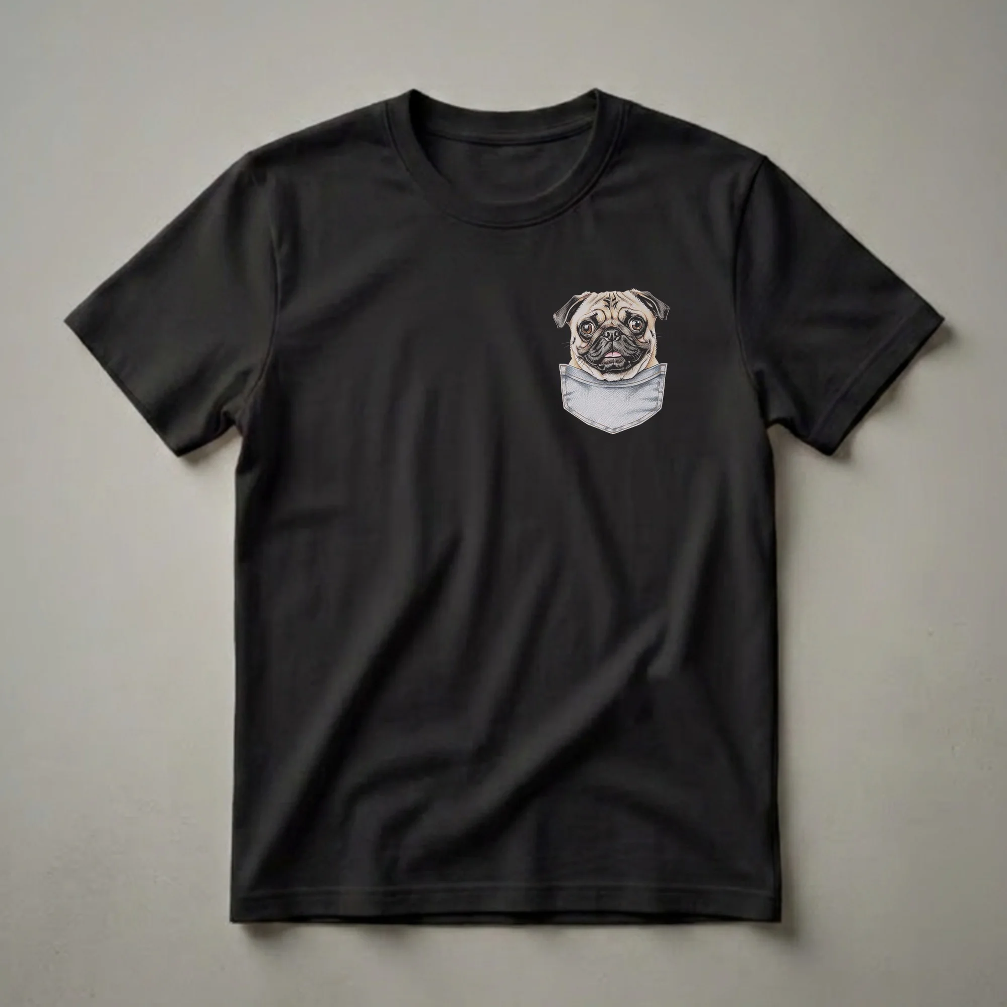 Pug owners who adore their wrinkly-faced companions will reach for this unique graphic tee. The design showcases a meticulously rendered drawing of a pug's head emerging from a light blue denim pocket. The pug's expressive eyes, characteristic facial wrinkles, and slightly open mouth with its tongue peeking out are captured with remarkable detail, giving the artwork a lifelike quality. Pugs, originally from China, are known for their charming, mischievous, and affectionate personalities, often described as clowns in a dog's body. This t-shirt is a thoughtful gift for any pug mom or dad, or for someone who appreciates detailed animal art. It's a conversation starter and a way to wear your affection for this beloved breed. This shirt works well for casual outings, dog park visits, or simply relaxing at home with your furry friend. The detailed drawing style adds a touch of artistic flair, making it more than just a novelty item but a piece of wearable art for dog lovers.