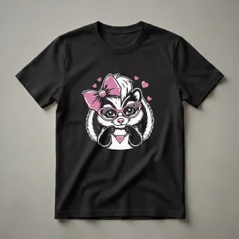 - Graphic tee featuring a cute skunk wearing glasses and a pink bow.