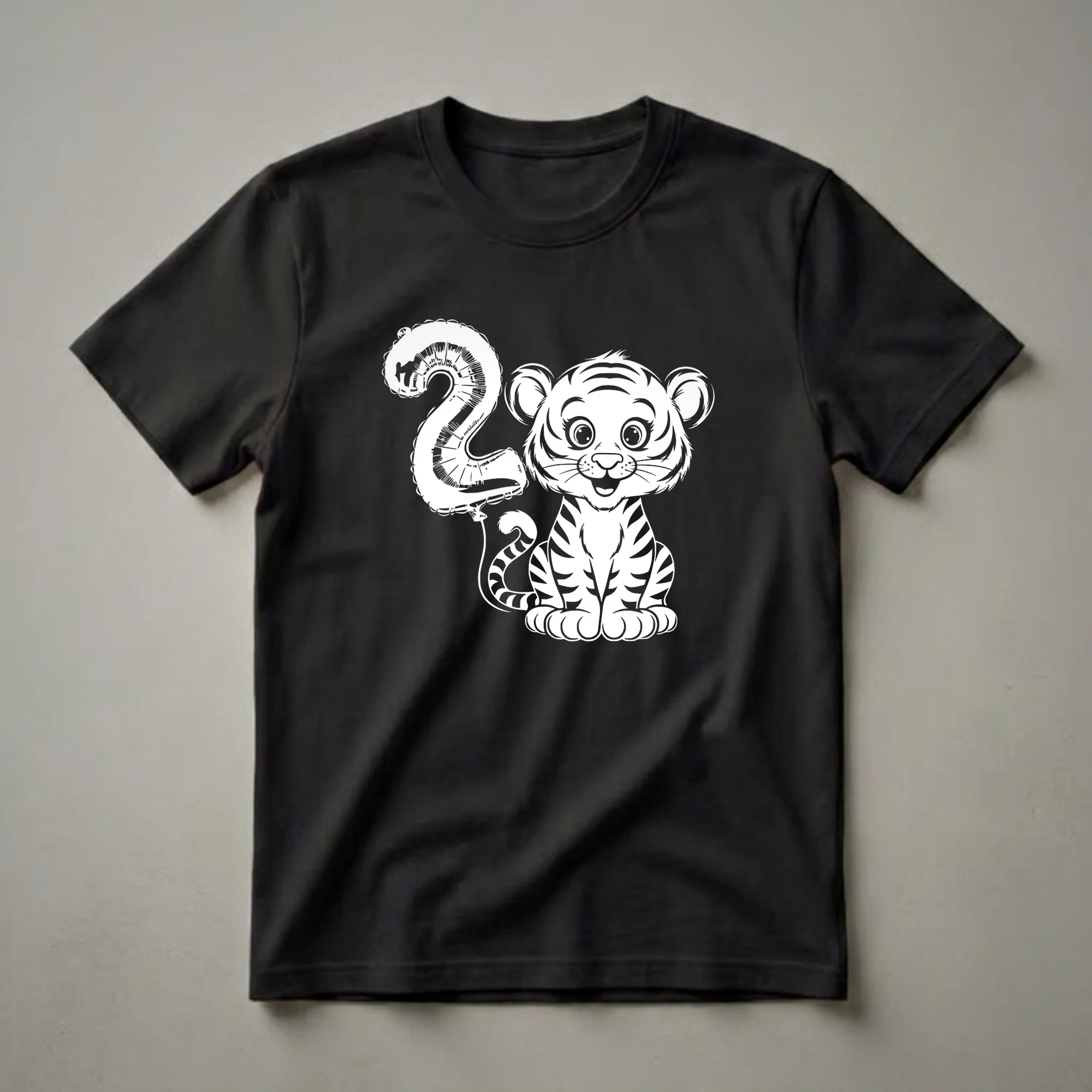 Two-year-olds are entering a new phase of exploration and discovery, and this playful tiger t-shirt captures that vibrant energy. The design features a charming cartoon tiger cub sitting beside a large, inflated balloon shaped like the number '2'. Tigers, known for their distinctive stripes and powerful presence in the wild, are often a favorite animal for young children. This graphic tee is a wonderful way for a child turning two to showcase their milestone birthday. It's a thoughtful gift for any toddler who loves animals or is excited about turning two. This shirt works well for birthday parties, playdates, or just everyday wear, making it a versatile addition to a young child's wardrobe. The simple, bold white-on-black design is eye-catching and a thoughtful choice for little ones celebrating their second birthday. Imagine the joy on their face when they see this cute tiger ready to celebrate with them! This apparel is sure to be a hit.