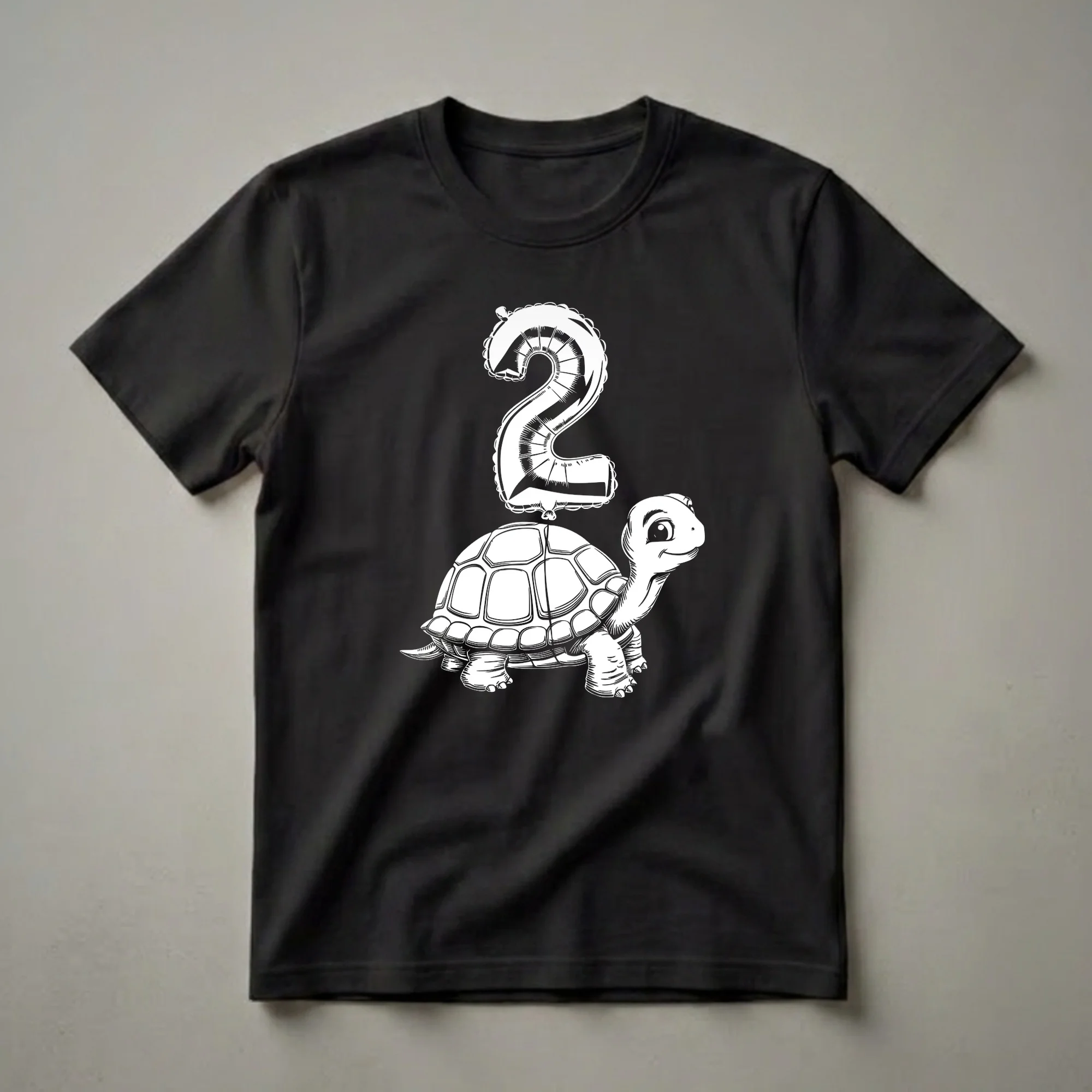 Two-year-olds are embarking on a new stage of discovery, and this charming turtle t-shirt captures that sense of wonder. The graphic features a friendly, smiling turtle rendered in a classic black and white line art style, looking up at a large, inflated balloon shaped like the number '2'. This design is a delightful way to commemorate a child's second birthday. Turtles, known for their longevity and steady pace, are a wonderful symbol for a growing toddler. This shirt is a thoughtful gift for any child turning two, whether it's for a birthday party, a family gathering, or just a special surprise. The playful imagery makes this tee a go-to choice for everyday wear, bringing a smile to the birthday boy or girl and everyone they meet. It’s a sweet way for a 2-year-old to express their personality on their big day, making their birthday celebration even more memorable. This graphic tee is sure to be a hit for any little one celebrating this milestone.
