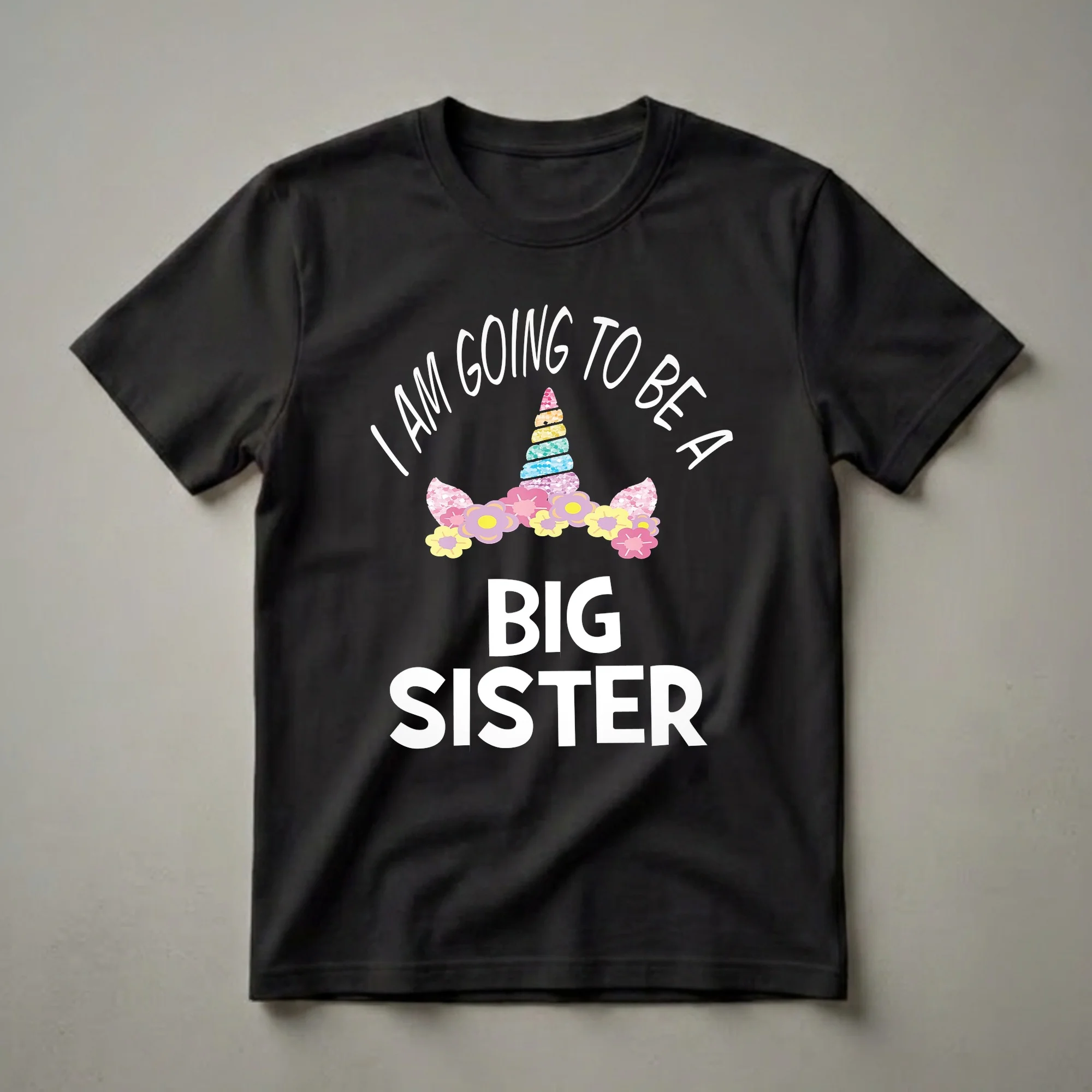 Announcing a new arrival is a special moment, and this "I Am Going To Be A Big Sister" unicorn graphic tee captures that excitement. The design features a vibrant, multi-colored unicorn horn adorned with a sparkling floral wreath, complete with pink, purple, and yellow blossoms. Below this enchanting imagery, the words "BIG SISTER" are boldly displayed in white, block lettering, signifying a proud new role. Arched above the unicorn is the phrase "I AM GOING TO BE A" in a playful white font. This shirt is a wonderful way for a young girl to share the news of an upcoming sibling. It's a thoughtful gift for any girl who loves unicorns and is about to become a big sister, great to wear to family gatherings or to announce the pregnancy. This t-shirt celebrates the transition into a new family dynamic, making it a cherished keepsake. The visual elements evoke a sense of magic and wonder, fitting for a child's imagination. This graphic tee is a fun way for her to express her new title.