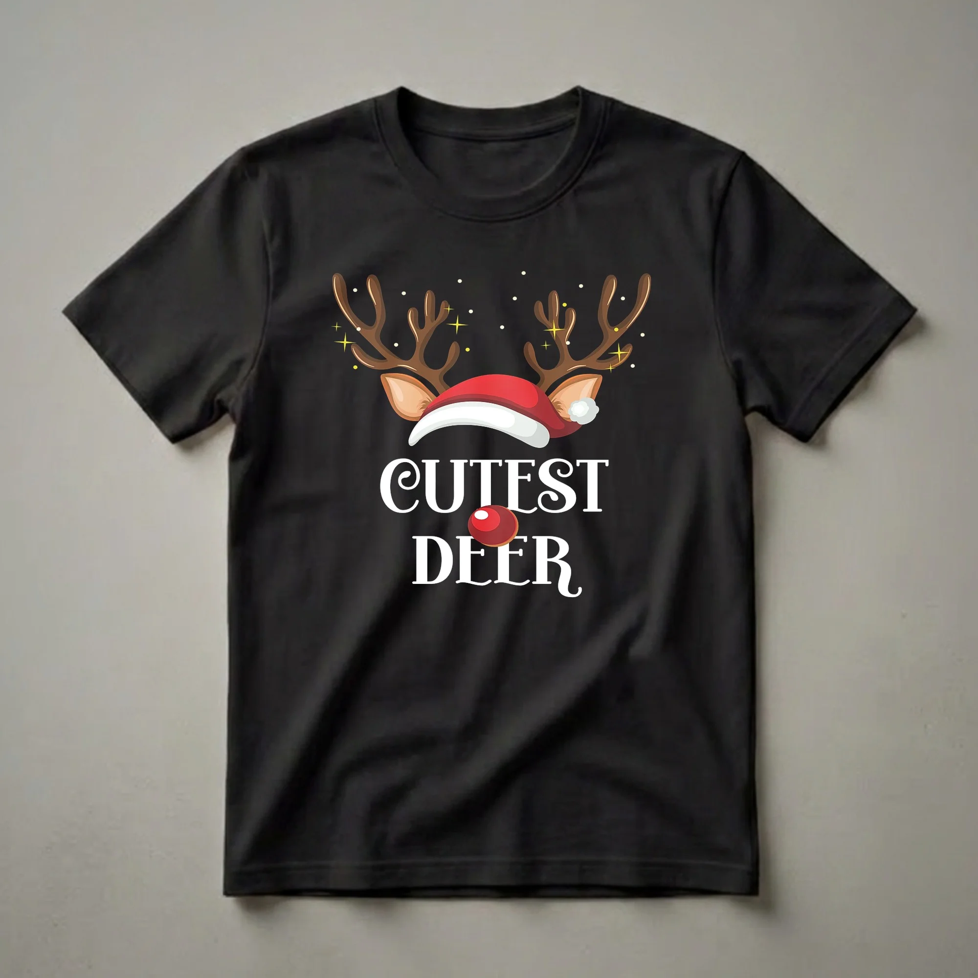 Families looking to coordinate their holiday attire will adore this "Cutest Deer" t-shirt. The design features a whimsical illustration of reindeer antlers adorned with a festive Santa hat and a bright red Rudolph-like nose. Scattered white dots and yellow sparkles add a touch of winter magic, evoking the spirit of a snowy Christmas Eve. This graphic tee is a playful way for family members to show their festive spirit during holiday gatherings, Christmas parties, or even casual wear throughout the season. Imagine the joy of capturing photos with everyone sporting these matching shirts, creating cherished memories. This shirt is a thoughtful gift for any family member who loves to embrace the holiday cheer and wants to stand out with a fun, coordinated look. It's a staple for anyone wanting to add a touch of reindeer charm to their Christmas celebrations, making it a go-to tee for the most wonderful time of the year. Wear it to your next holiday brunch or while opening presents on Christmas morning.