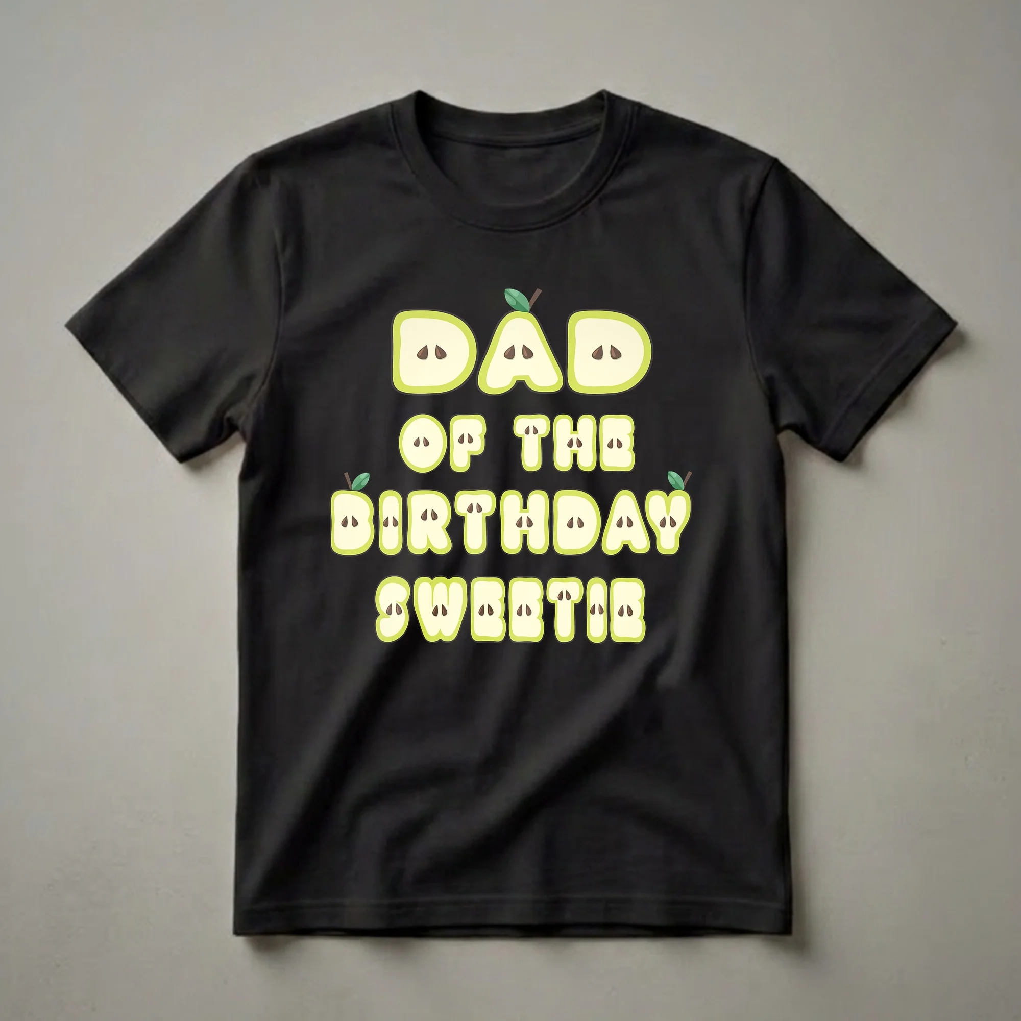 Fathers who are celebrating their daughter's special day will reach for this eye-catching graphic tee. The design features bold, playful lettering that spells out 'DAD OF THE BIRTHDAY SWEETIE'. Each letter is creatively rendered to resemble a slice of a green pear, complete with seeds and a stem, adding a whimsical, fruity touch. This t-shirt is a thoughtful gift for any dad whose daughter is the center of attention on her birthday. Imagine him wearing this shirt to her birthday party, a family gathering, or even just for a casual outing, proudly displaying his role as the dad of the birthday girl. It’s a fun way to show appreciation and join in the festive spirit. This shirt works well for dads who enjoy unique and humorous designs that celebrate family milestones. The vibrant green and cream colors of the fruit-inspired letters stand out against a dark background, making the message clear and cheerful. It’s a staple in the collection for any dad looking to commemorate his daughter's birthday with a smile.