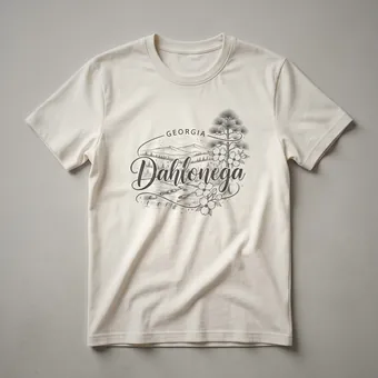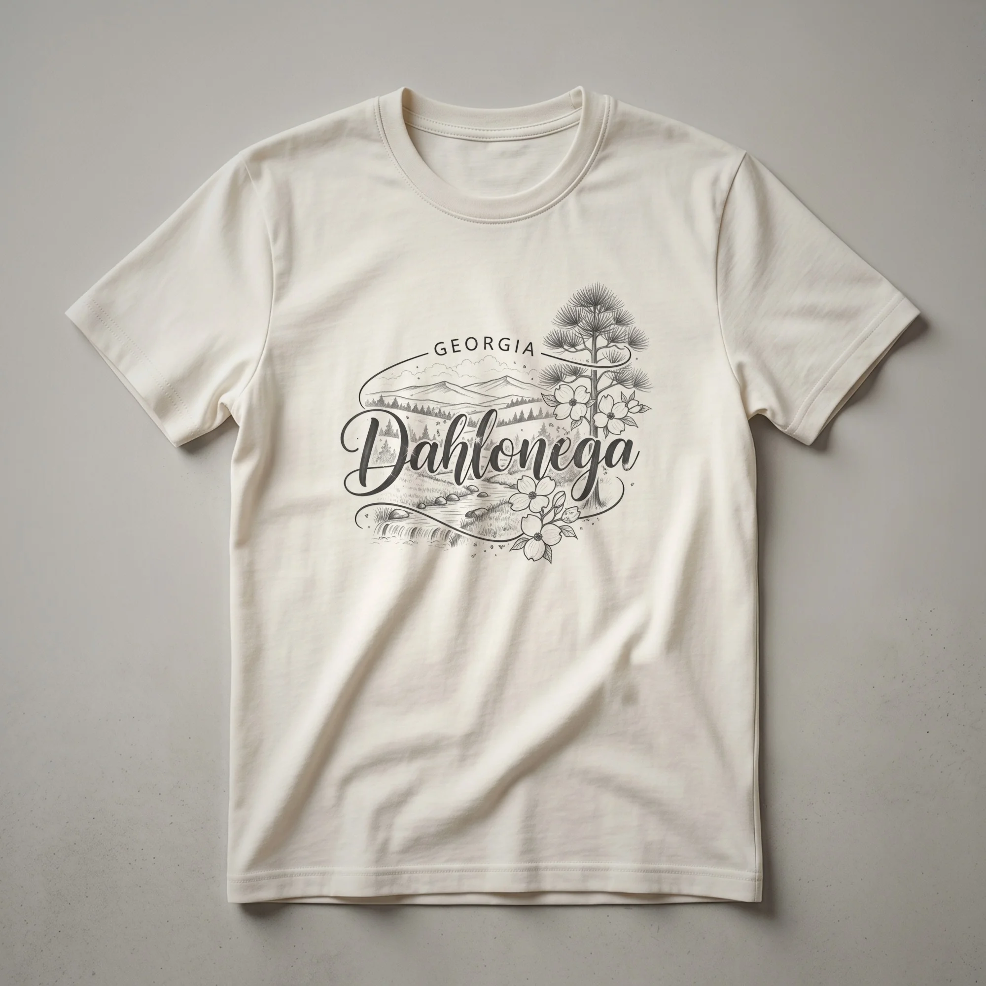 Dahlonega, Georgia residents and visitors can now showcase their appreciation for this charming Southern town with this distinctive graphic tee. The artwork features the name "Dahlonega" in elegant script, overlaid on a picturesque scene. Above the town name, "GEORGIA" is written in a complementary font, grounding the design in its state. The background depicts rolling mountains, a dense forest of pine trees, and a winding river or stream, evoking the natural beauty of the North Georgia mountains. To the right, a tall pine tree stands prominently, adorned with delicate dogwood blossoms, the state flower of Georgia. This t-shirt is a thoughtful gift for anyone who has a connection to Dahlonega, whether they live there, have visited, or simply admire its unique character. It's a great way to remember a trip or celebrate local pride. Wear this shirt to casual outings, exploring local attractions, or to events celebrating Georgia heritage. This tee is a staple for anyone wanting to carry a piece of Dahlonega with them.