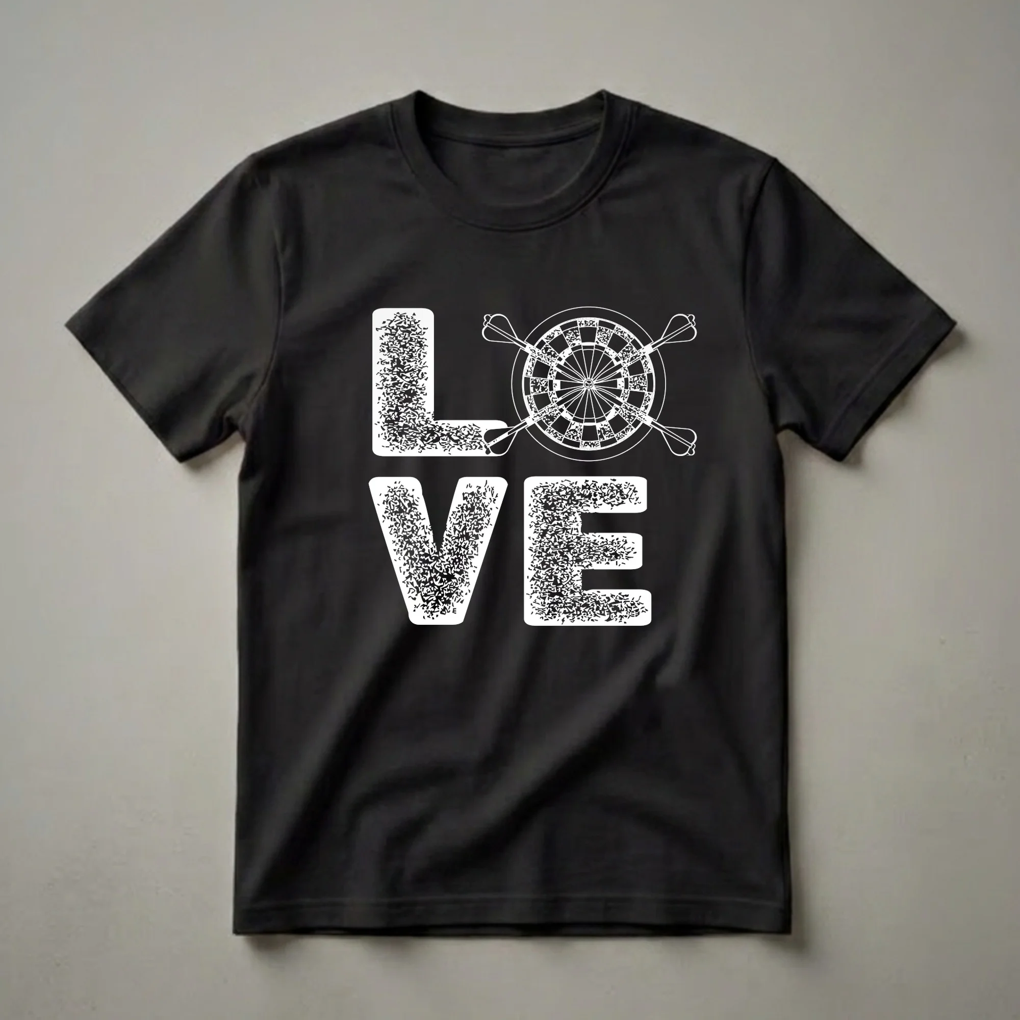- Features a bold 'LOVE' design with a dartboard and darts.