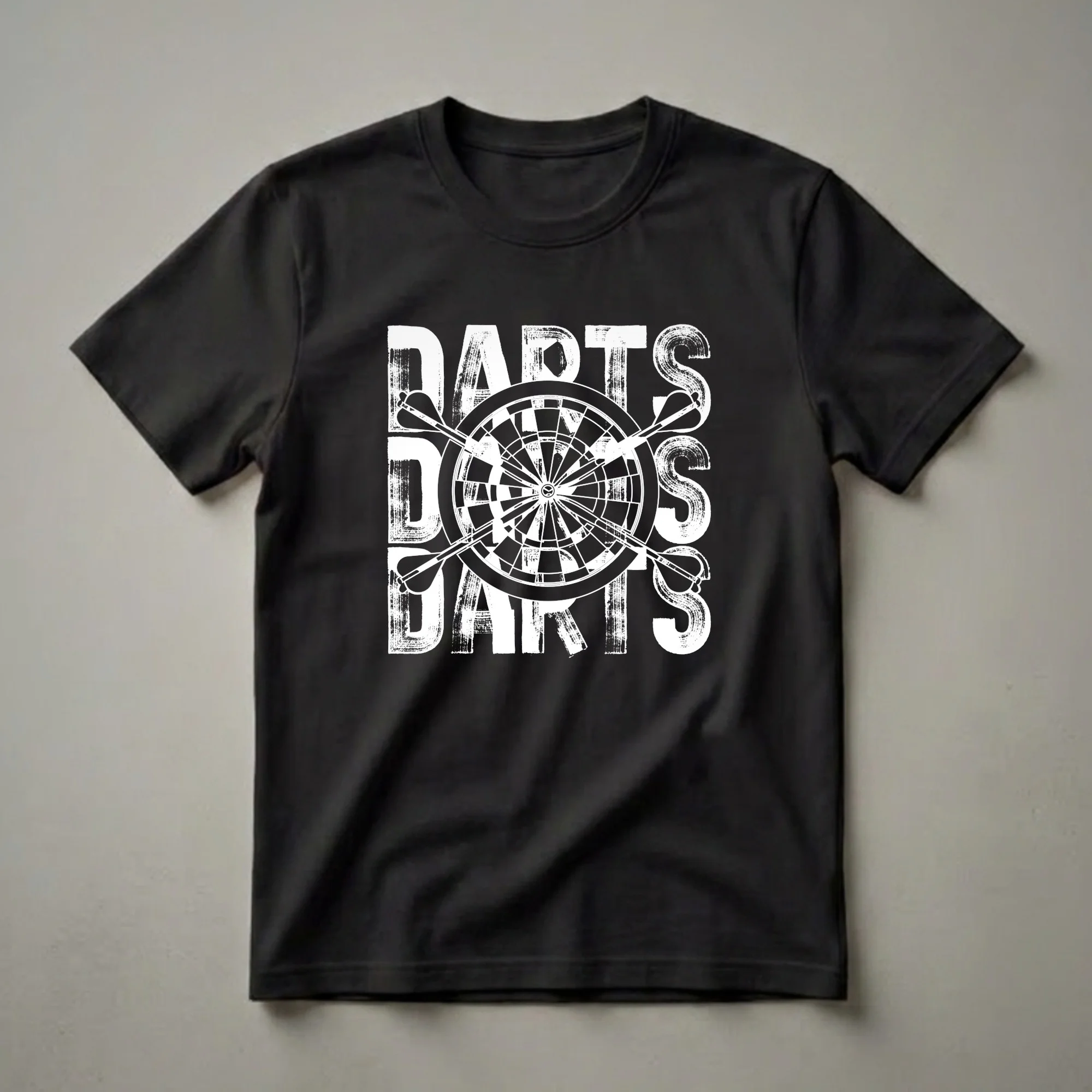 Darts players who want to wear their passion on their sleeve will appreciate this striking graphic tee. The design features the word 'DARTS' repeated in a bold, distressed font, creating a powerful visual statement. Centered within the text is a classic dartboard, complete with its intricate scoring segments and a bullseye, along with three feathered darts poised for action. This shirt is a thoughtful gift for the darts enthusiast in your life, whether they play casually at home or compete in leagues. Darts requires precision, focus, and a steady hand, making it a game that appeals to those who enjoy a challenge. This t-shirt works well for casual outings, game nights, or even to wear to the pub while playing a friendly match. It's a staple in the collection for anyone who lives and breathes the sport of darts, offering a comfortable and stylish way to express their love for the game. Celebrate your favorite player or treat yourself to this eye-catching apparel.