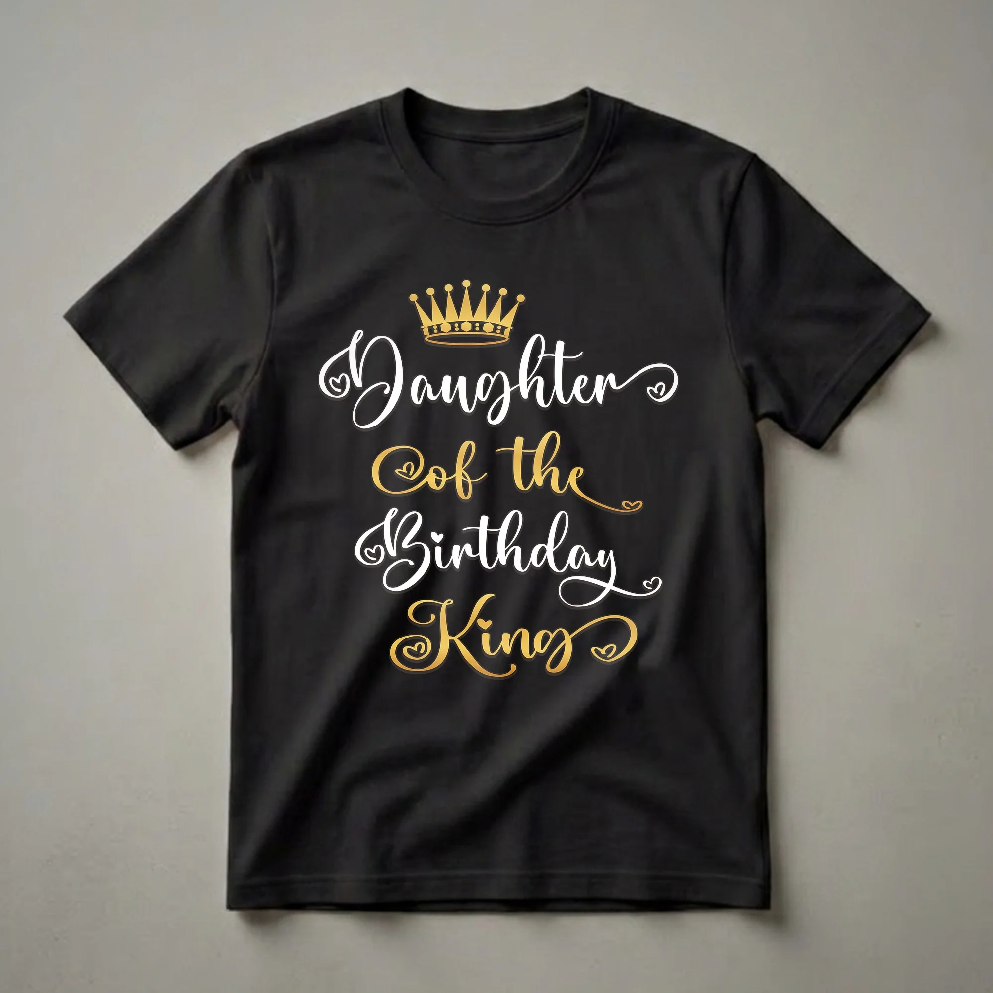 - This tee features elegant script text 'Daughter of the Birthday King' in white and gold.