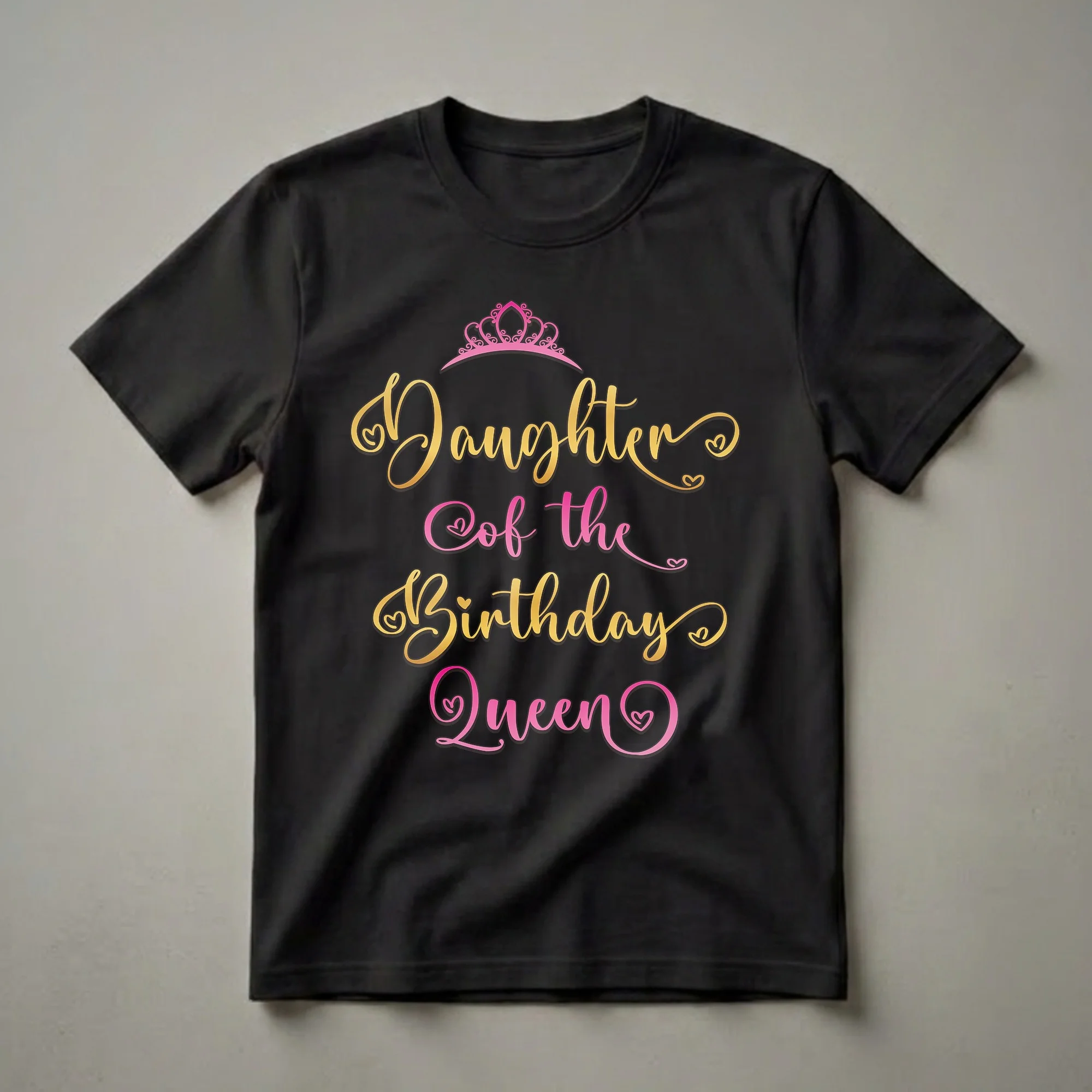 Daughters can proudly stand by their queen with this eye-catching graphic tee. The design features a regal pink crown atop elegant script that reads 'Daughter of the Birthday Queen.' The words 'Daughter' and 'Birthday Queen' are rendered in a shimmering gold, while 'of the' is presented in a vibrant pink, creating a striking contrast against any shirt color. This t-shirt is a thoughtful gift for any daughter whose mother is celebrating a milestone birthday or any special occasion. It’s a fantastic way for the whole family to coordinate their outfits for birthday parties, family gatherings, or even a special birthday brunch. Imagine the photos with the birthday queen and her royal court all sporting matching or complementary shirts! This apparel is more than just clothing; it's a statement of family pride and celebration. It’s a go-to tee for any daughter wanting to feel like part of the royal celebration. This shirt is for the daughter who wants to honor her mother on her special day, making the birthday girl feel even more celebrated.