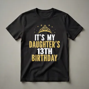 Turning thirteen marks a significant milestone, transitioning from childhood to the teenage years, and this graphic tee is a celebratory way to acknowledge that moment. The design features bold, distressed white text that reads "IT'S MY" and "13TH", positioned above equally striking gold glitter-effect text spelling out "DAUGHTER'S" and "BIRTHDAY". Crowning the design is an ornate gold crown, complete with sparkling stars scattered around it, evoking a sense of royalty and celebration. This t-shirt is a thoughtful gift for any parent looking to commemorate their daughter's thirteenth birthday. It's a fun way for the birthday girl to express her excitement about reaching this special age. She will reach for this tee to wear to her birthday party, family gatherings, or any celebration marking her entry into adolescence. This shirt is a fantastic way to make her feel like the queen of her special day, celebrating the transition into her teenage years with style and sparkle.