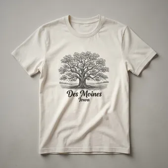 Des Moines residents and visitors who appreciate the natural beauty of the state will reach for this distinctive graphic tee. The design showcases a beautifully rendered sketch of a large, mature oak tree, its branches reaching outwards, symbolizing strength and longevity. This iconic tree stands against a backdrop of subtle rolling hills, evoking the classic Iowa landscape. Below the illustration, the words 'Des Moines Iowa' are elegantly scripted, making it clear this apparel celebrates the capital city. Iowa is known for its fertile plains and agricultural heritage, and the oak tree is a symbol of the state's enduring natural resources. This shirt is a thoughtful gift for anyone who calls Des Moines home, has roots in Iowa, or simply admires the state's serene countryside. Wear this tee to local events, casual outings, or while exploring the city to showcase your connection to the Hawkeye State. It's a staple in any collection for those who carry a piece of Iowa with them.