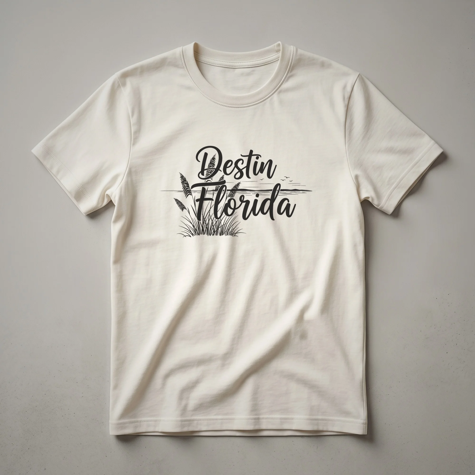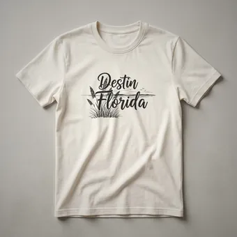 Destin, Florida, a popular vacation spot on the Emerald Coast, is celebrated with this artistic graphic tee. The design features the words 'Destin Florida' in a flowing, script-like font, evoking a sense of coastal charm. Below the text, a subtle silhouette depicts a serene beach scene, complete with tall dune grasses swaying in the breeze and a distant horizon line with a few small birds in flight. This visual evokes the relaxed atmosphere and natural beauty that draws visitors to the Florida Panhandle. Destin is renowned for its white sandy beaches and clear turquoise waters, making it a prime destination for fishing, boating, and family vacations. This t-shirt serves as a wearable memento for anyone who has experienced the unique allure of this Gulf Coast city. It's a thoughtful gift for friends or family members planning a trip to Destin or those who cherish memories of past visits. Wear this shirt to casual outings, beach days, or while reminiscing about your time on the Emerald Coast, celebrating your connection to this vibrant Florida locale.
