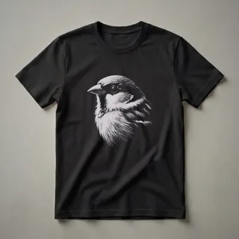 Bird watchers and wildlife enthusiasts will appreciate the intricate detail of this sparrow drawing t-shirt. The artwork features a close-up, stippled illustration of a sparrow's head, rendered in shades of white and grey against a stark black background. The fine lines and dots create a realistic texture, highlighting the bird's feathers, keen eye, and sharp beak. Sparrows are among the most common and widespread birds globally, often found in urban and rural environments across continents. Their adaptability allows them to thrive near human settlements, making them a familiar sight for many. This tee is a wonderful way for any bird lover to express their passion for these ubiquitous yet fascinating creatures. It makes a thoughtful gift for anyone who enjoys observing nature or appreciates detailed wildlife art. Wear this shirt on your next nature walk, to a birdwatching event, or simply as a conversation starter about your favorite feathered friends. This graphic tee is a staple for any nature-inspired wardrobe.