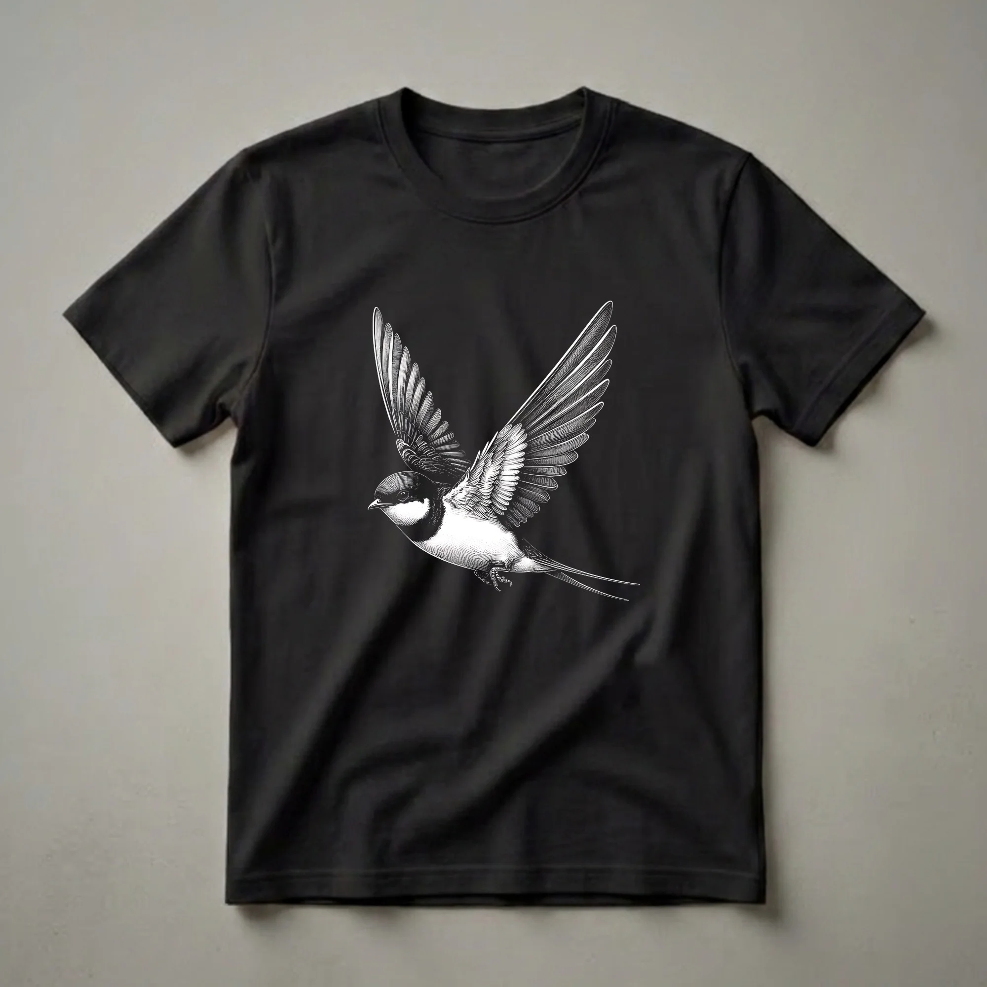 Birdwatchers and nature enthusiasts will appreciate the intricate detail of this swallow graphic art t-shirt. The design features a single swallow in mid-flight, rendered in a classic black and white illustration style that emphasizes the delicate structure of its wings and tail feathers. Swallows are known for their aerial acrobatics, often seen swooping and diving as they catch insects in flight. This particular depiction captures that dynamic movement, making it a striking piece of apparel for anyone who admires these agile birds. The Barn Swallow, a common species, is recognizable by its deeply forked tail and iridescent blue-black upperparts. These birds are migratory, traveling thousands of miles each year between their breeding grounds in North America and their wintering grounds in South America. This tee works well for casual outings, nature walks, or simply relaxing at home while celebrating your passion for ornithology. It makes a thoughtful gift for the birder in your life who can identify these swift flyers by their distinctive silhouette against the sky. This shirt is a staple for anyone who enjoys the beauty of the natural world and wants to wear their appreciation.