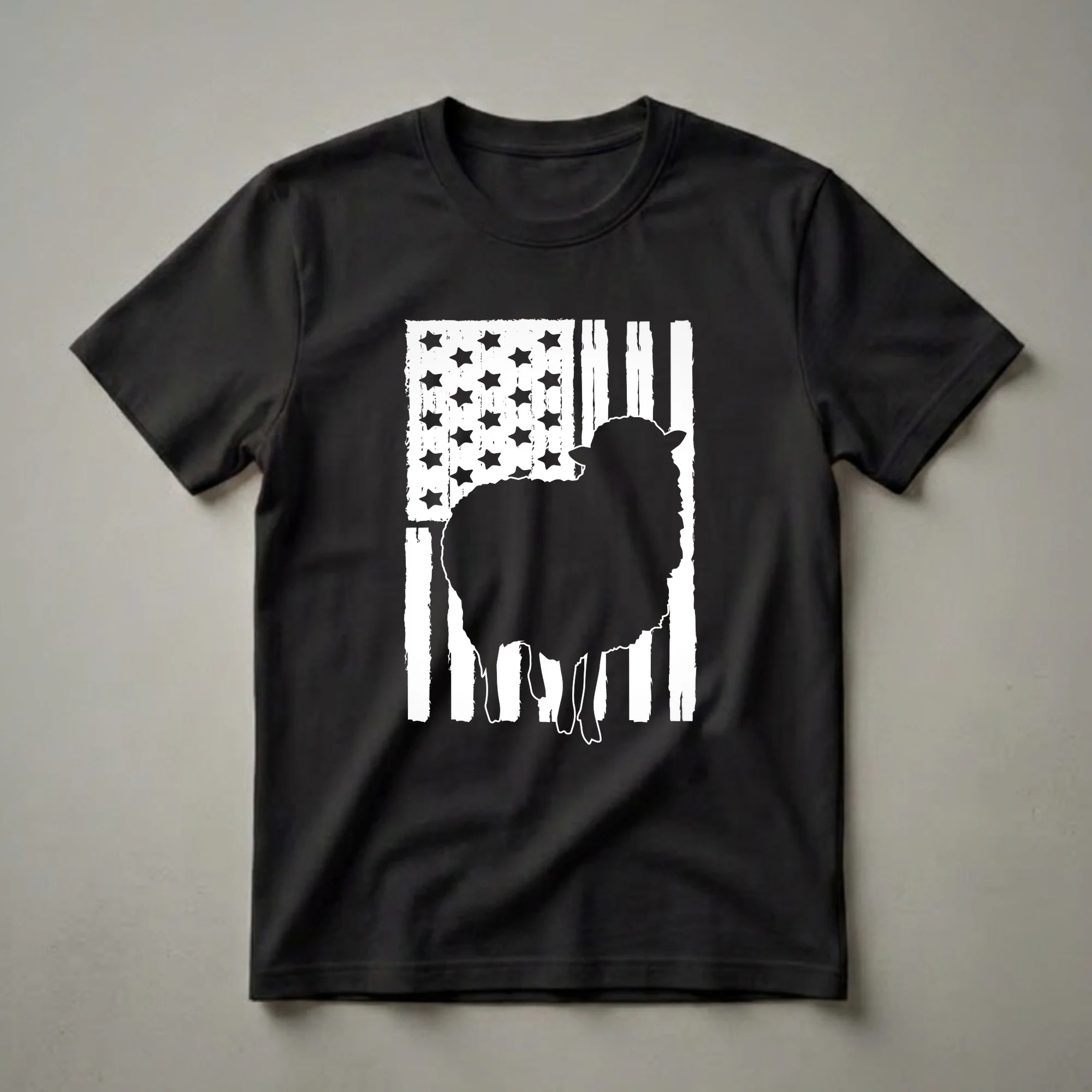 Farm animal lovers who also hold a deep appreciation for their country will reach for this striking graphic tee. The design features a bold black silhouette of a sheep, its woolly texture subtly hinted at by the outline, standing proudly against a distressed white American flag. The flag's stripes and stars are rendered with a grunge effect, giving it a vintage, well-loved appearance that speaks to enduring patriotism. Sheep, known for their gentle nature and importance in agriculture, are a symbol of pastoral life and the farming heritage that is integral to the American landscape. This shirt is more than just apparel; it's a statement of identity for those who connect with the land and its creatures. It makes a thoughtful gift for anyone who cherishes both their rural roots and their national pride. Wear this tee to local farmers' markets, country fairs, or simply as a comfortable and meaningful addition to your everyday wardrobe, celebrating the blend of agriculture and patriotism.