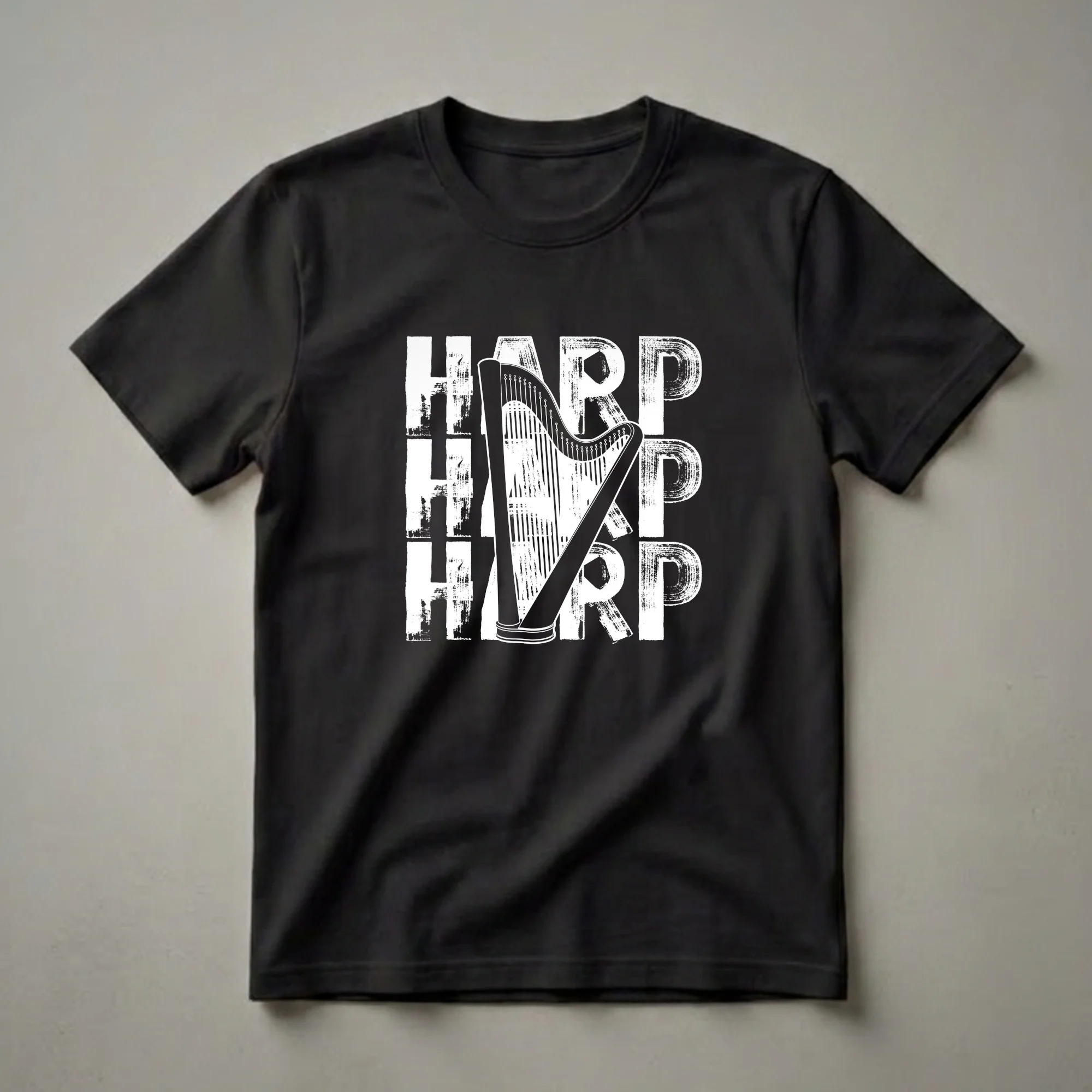 Harpists who want to showcase their passion will reach for this striking graphic tee. The design features the word "HARP" repeated three times in a bold, distressed white font, with a detailed illustration of a harp placed centrally. The harp, a stringed musical instrument that is played by plucking the strings with the fingers, is depicted with its characteristic frame and numerous strings. This shirt is a thoughtful gift for any musician dedicated to the angelic sounds of the harp, whether they play in an orchestra, a chamber ensemble, or as a solo performer. It's a staple in the collection for music lovers to express their appreciation for this elegant instrument. Wear this t-shirt to rehearsals, concerts, or casual gatherings to connect with fellow music enthusiasts. The harp's rich history dates back centuries, evolving from simple ancient lyres to the complex concert harps of today, making it a truly iconic instrument in the world of music. This apparel celebrates that legacy.