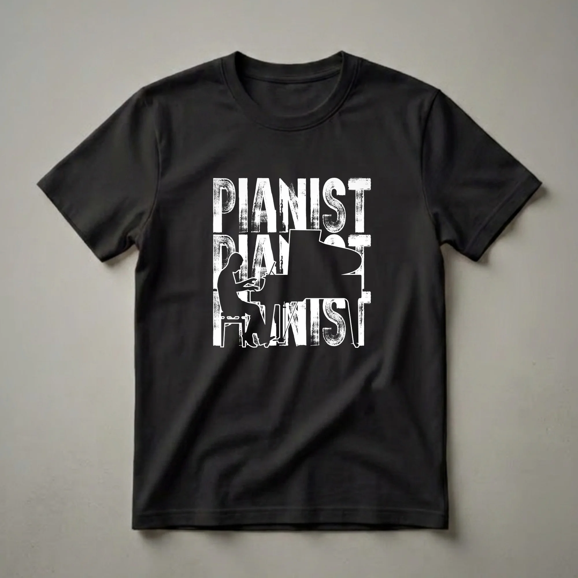- Features a distressed "PIANIST" word art design with a grand piano silhouette.