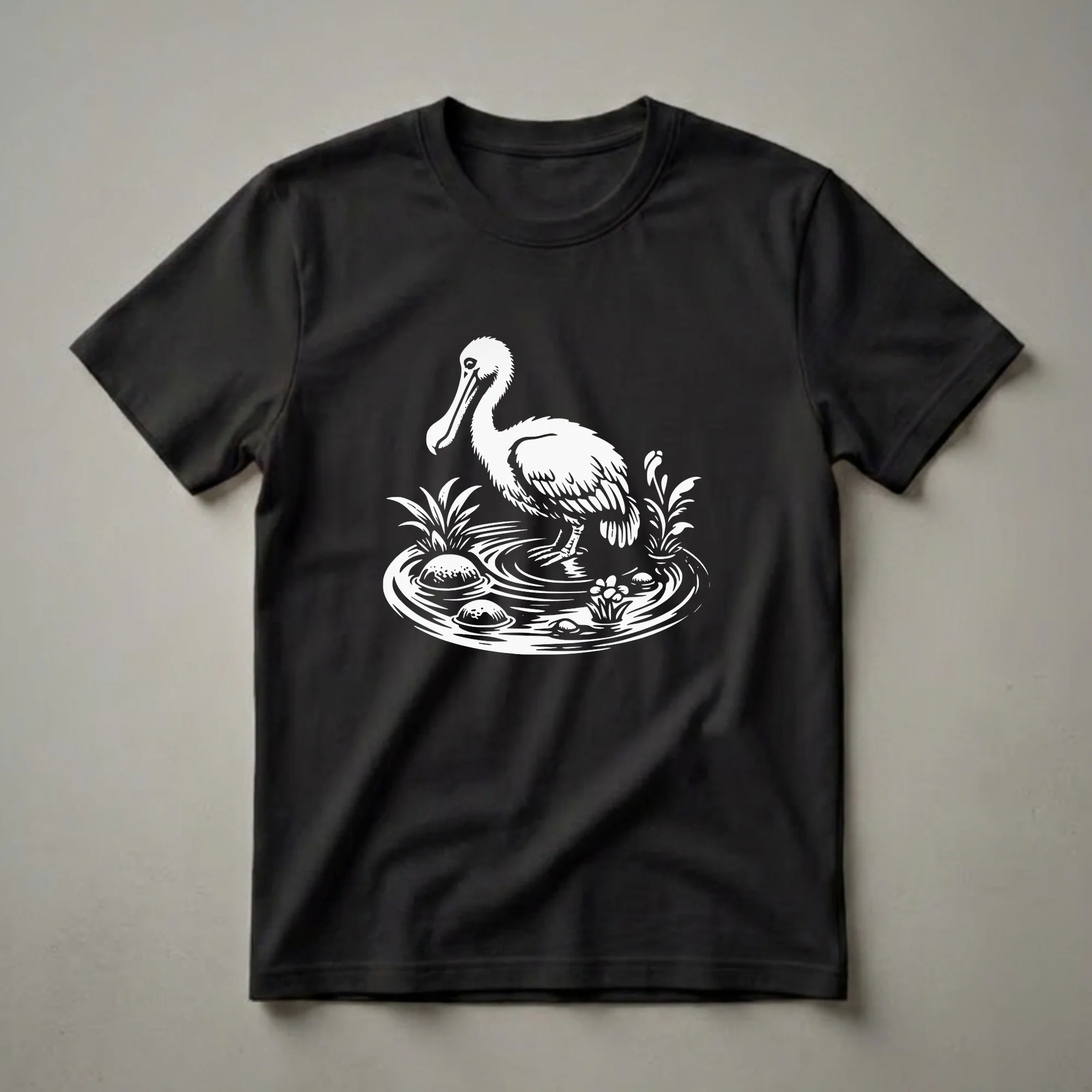 Bird watchers and ornithologists will appreciate this striking graphic t-shirt featuring a dodo bird. The design depicts the extinct bird standing in a shallow body of water, surrounded by stylized reeds and small flowers. The dodo, a flightless bird native to Mauritius, became extinct in the late 17th century due to human activity and introduced species. This shirt captures a moment of this fascinating creature in its natural habitat, rendered in a bold, graphic art style. It's a conversation starter for anyone interested in paleontology, extinct species, or unique bird art. This tee makes a thoughtful gift for the bird enthusiast in your life who appreciates a touch of natural history. Wear this shirt to your next birdwatching outing or to a casual gathering where you can share your passion for avian wonders. The detailed linework and stark contrast of the design make it a standout piece for any wardrobe, celebrating a bird that continues to capture the imagination.