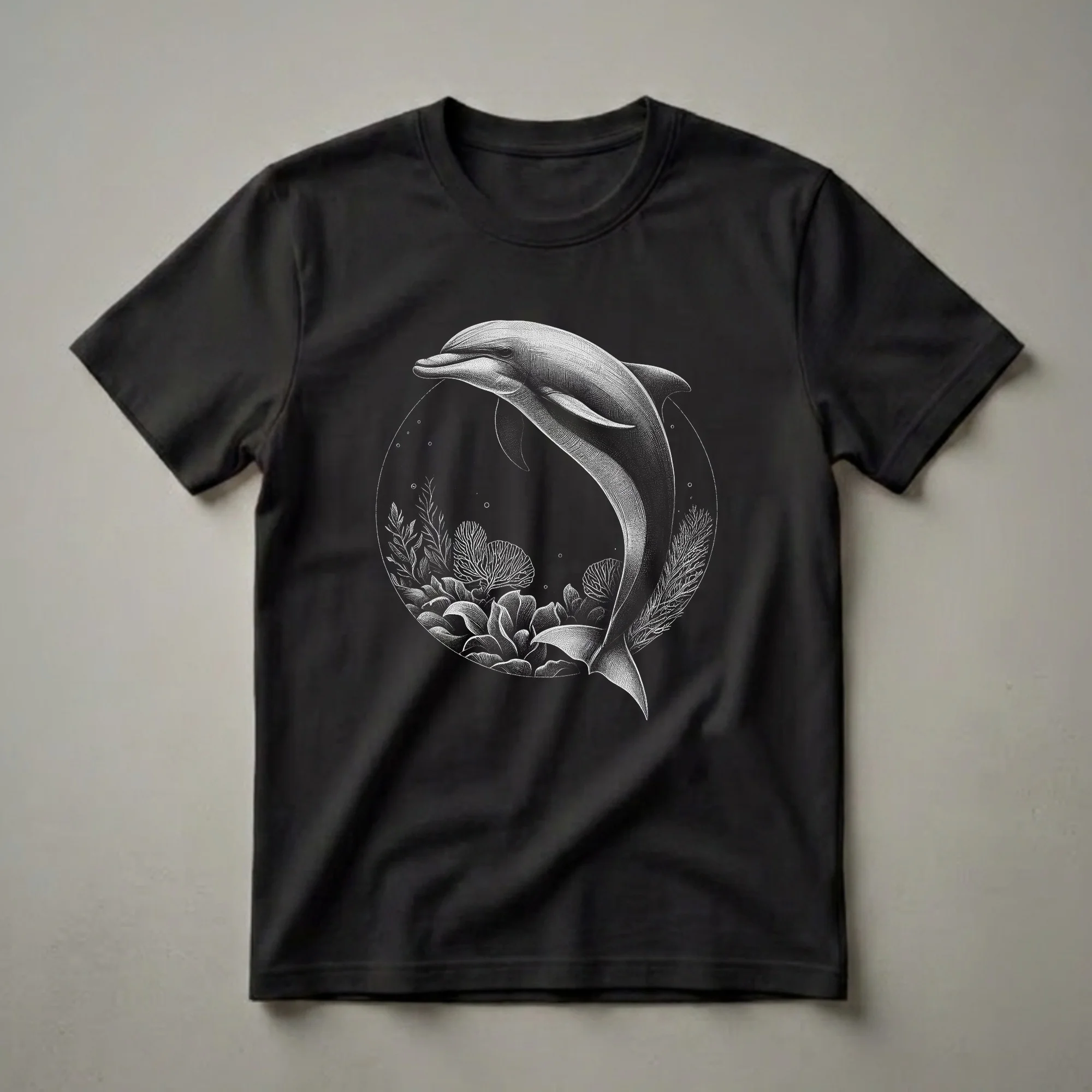 Ocean lovers and marine life admirers will reach for this unique dolphin t-shirt. The striking artwork depicts a dolphin in mid-leap, rendered in a detailed, monochromatic style that evokes classic etchings. This graphic tee is framed within a circular motif, showcasing a vibrant underwater scene complete with intricate coral formations and flowing seaweed. Small bubbles drift upwards, adding to the aquatic ambiance. Dolphins, known for their intelligence and playful nature, are found in oceans worldwide, often in pods that travel vast distances. This shirt is a thoughtful gift for anyone who appreciates the beauty of the ocean and its inhabitants. It's a perfect wear for casual outings, beach trips, or simply relaxing at home while dreaming of the sea. The detailed linework and classic aesthetic make this tee a standout piece for any wildlife enthusiast's wardrobe. Embrace the spirit of the ocean with this eye-catching dolphin apparel, a true celebration of marine wonder.