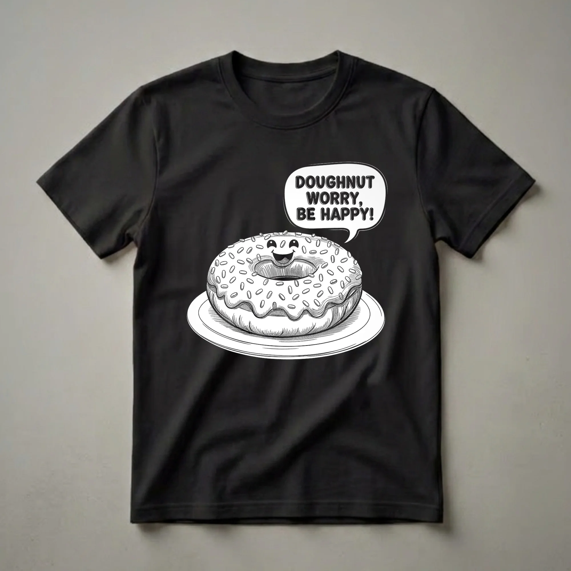 Embrace a positive outlook with this humorous graphic tee featuring a smiling donut, ready to spread a sweet message. The design features a whimsical, hand-drawn donut with a wide, joyful smile and sprinkles scattered across its glazed surface. This cheerful pastry sits on a simple plate, ready to deliver its uplifting message: 'Doughnut Worry, Be Happy!' in a playful speech bubble. This shirt is a thoughtful gift for anyone who finds joy in simple pleasures and a good laugh, especially those who believe a donut can solve many of life's little worries. It's a staple in the collection for those who enjoy a bit of lightheartedness in their wardrobe. Wear this t-shirt to casual gatherings, game nights, or simply when you want to spread a little happiness. The playful illustration style adds a unique charm, making it a conversation starter for fellow food enthusiasts. This tee is a reminder to stay positive and enjoy the sweet moments in life, just like a delicious donut.