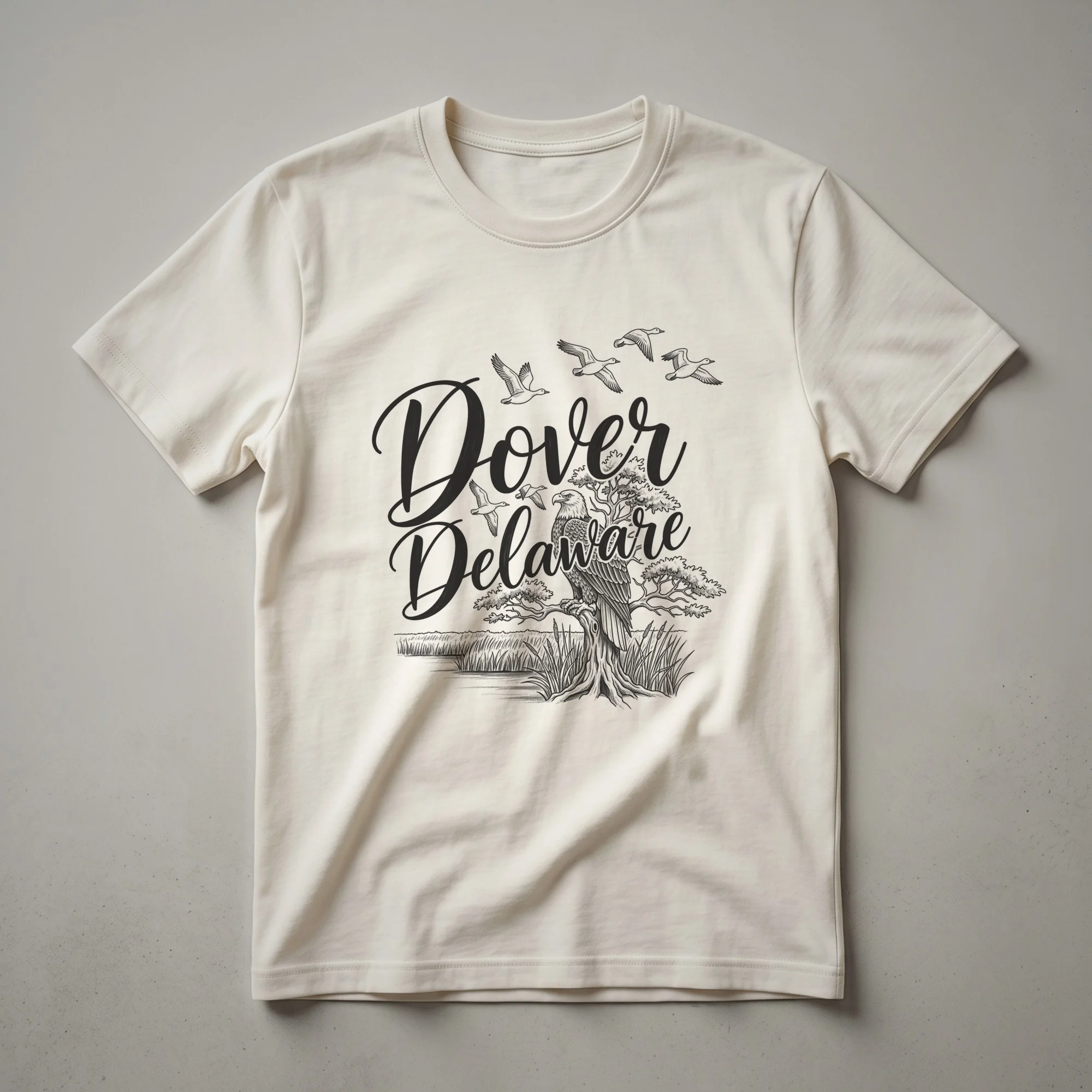 Dover, Delaware residents and visitors who appreciate the natural beauty of the First State will reach for this distinctive graphic tee. The design showcases a sketch-art style illustration that captures the essence of Dover's landscape. Prominently featured is a majestic eagle perched on the sturdy branches of a tree, symbolizing strength and freedom. Above, a flock of ducks takes flight, evoking images of the state's abundant wildlife and wetlands. The words "Dover Delaware" are rendered in an elegant, flowing script, anchoring the design to its namesake city. This shirt is more than just apparel; it's a wearable piece of art that celebrates Delaware's heritage and natural scenery. It makes a thoughtful gift for anyone who calls Dover home, has fond memories of the area, or simply admires the state's rich natural environment. Wear this tee to local events, casual outings, or while exploring the scenic beauty of Delaware, making a subtle yet proud statement of your connection to Dover.