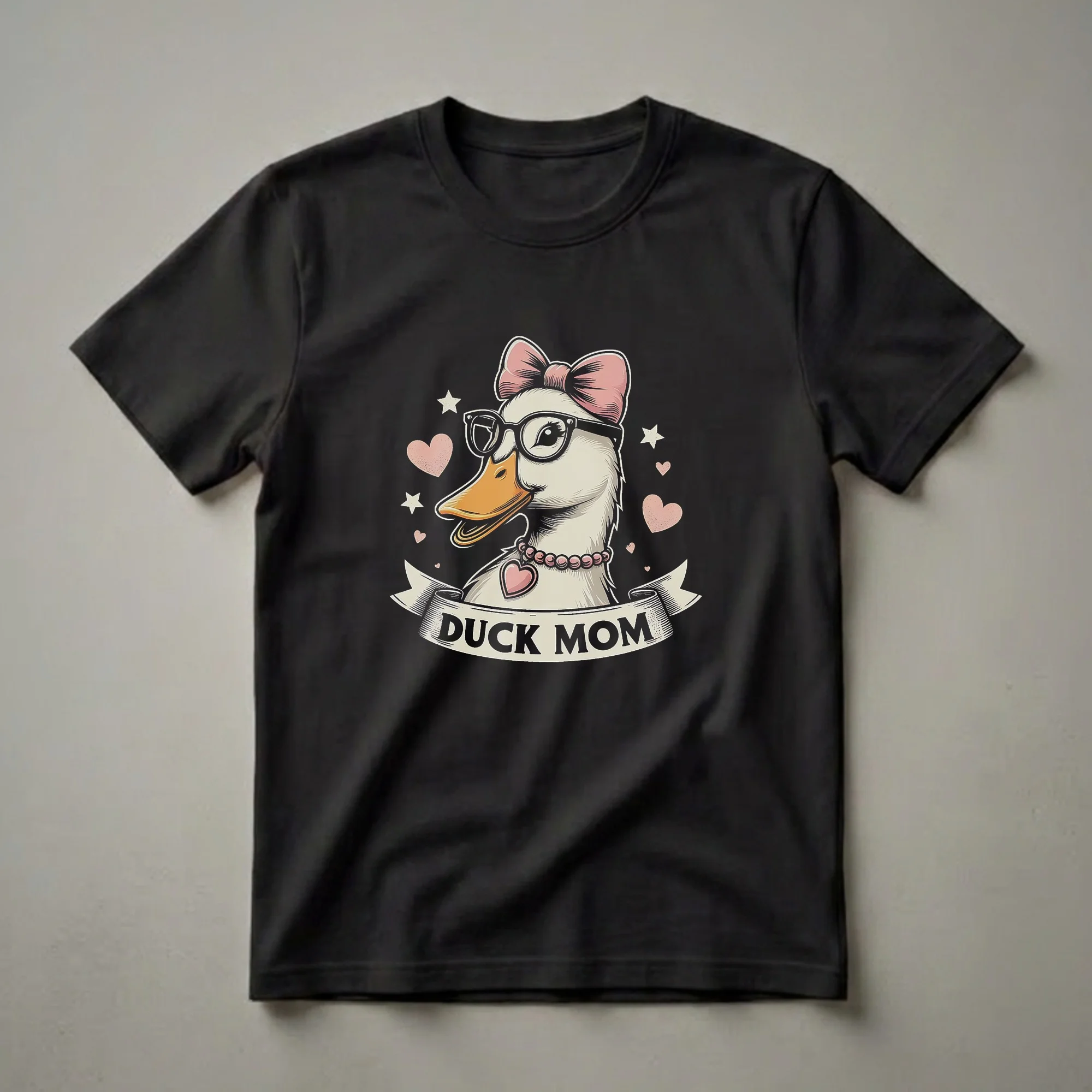 Duck moms know the unique joy of caring for these fascinating waterfowl. This graphic tee celebrates that special bond with a whimsical design. The artwork features a stylized duck wearing chic black-rimmed glasses and a sweet pink bow atop its head, complemented by a pearl necklace with a heart pendant. A banner below proudly proclaims 'DUCK MOM,' making it clear who this shirt is for. Scattered hearts and stars add a playful touch to the overall composition. Ducks, belonging to the Anatidae family, are known for their aquatic habits and distinctive calls. This shirt is a wonderful way for women who raise ducks, rescue ducks, or simply adore them to express their passion. It makes a thoughtful gift for birthdays, holidays, or just because for the duck mom in your life. Wear this comfortable tee to the farm, to a casual outing, or while tending to your flock. This shirt is a go-to for any duck enthusiast.