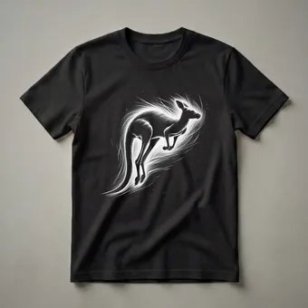 Wildlife enthusiasts will appreciate the dynamic portrayal of a kangaroo in mid-leap on this eye-catching graphic tee. The artwork features a bold black silhouette of the marsupial, set against a stark black background. Radiating outwards from the kangaroo are energetic white lines and a stippled texture, creating a sense of movement and power. This design captures the essence of the kangaroo's incredible agility and its status as an iconic symbol of the Australian outback. Kangaroos are known for their powerful hind legs and tails, which they use for balance and propulsion, allowing them to cover vast distances across diverse habitats, from grasslands to forests. This t-shirt works well for anyone who admires these fascinating creatures. It makes a thoughtful gift for the hiker, nature photographer, or wildlife admirer in your life. Wear this shirt on your next outdoor adventure or casual outing to express your connection with the natural world. This unique shirt is a great conversation starter for fellow animal lovers.