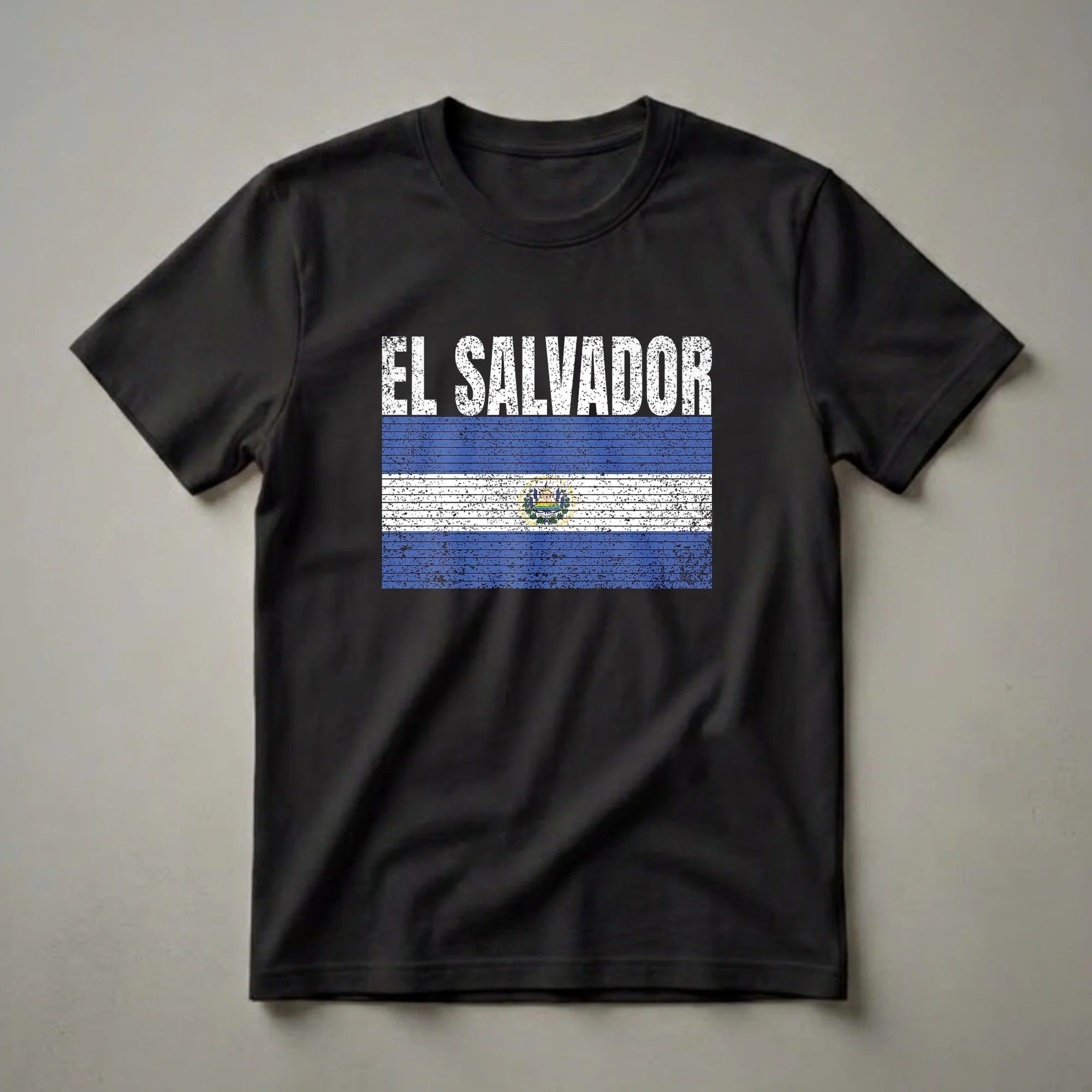 Salvadorean heritage is celebrated with this striking graphic tee, featuring the national flag in a distressed vintage style. The flag itself is composed of three horizontal stripes: two blue bands at the top and bottom, separated by a white middle stripe. Centered on the white stripe is the El Salvador coat of arms, a triangular emblem surrounded by a wreath and inscribed with the words 'REPUBLICA DE EL SALVADOR EN LA AMERICA CENTRAL'. The text 'EL SALVADOR' is prominently displayed in bold, distressed white lettering above the flag. This shirt is a fantastic way for Salvadorean expats, diaspora members, or anyone with a connection to the country to display their national pride. It makes a thoughtful gift for friends or family who cherish their roots. Wear this Salvadorean flag shirt to cultural events, family gatherings, or simply as a daily reminder of your homeland. The vintage aesthetic gives it a timeless appeal, suitable for anyone wanting to represent El Salvador with a touch of retro style. This t-shirt is a staple for those who want to wear their heritage proudly.