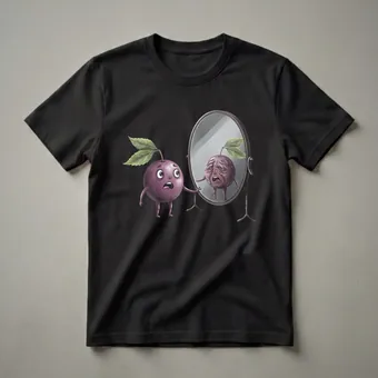 Elderberry lovers and foodies who appreciate a good laugh will reach for this humorous graphic tee. The design showcases a plump, purple elderberry character with wide, worried eyes and an open mouth, reaching out towards a mirror. In the reflection, the same elderberry appears shriveled and wrinkled, with a distressed expression, highlighting the humor of aging. This visual gag plays on the natural transformation of fruit over time, offering a relatable and lighthearted take on the aging process. Elderberries themselves are known for their antioxidant properties and are often used in jams, syrups, and wines, making this shirt a thoughtful gift for those who enjoy cooking, baking, or simply appreciate the culinary world. This t-shirt works well for casual outings, game nights, or as a conversation starter at food festivals. It's a unique way for anyone with a sense of humor and a love for fruit-themed art to express themselves. The artwork's whimsical style and relatable theme make it a standout piece for any wardrobe.