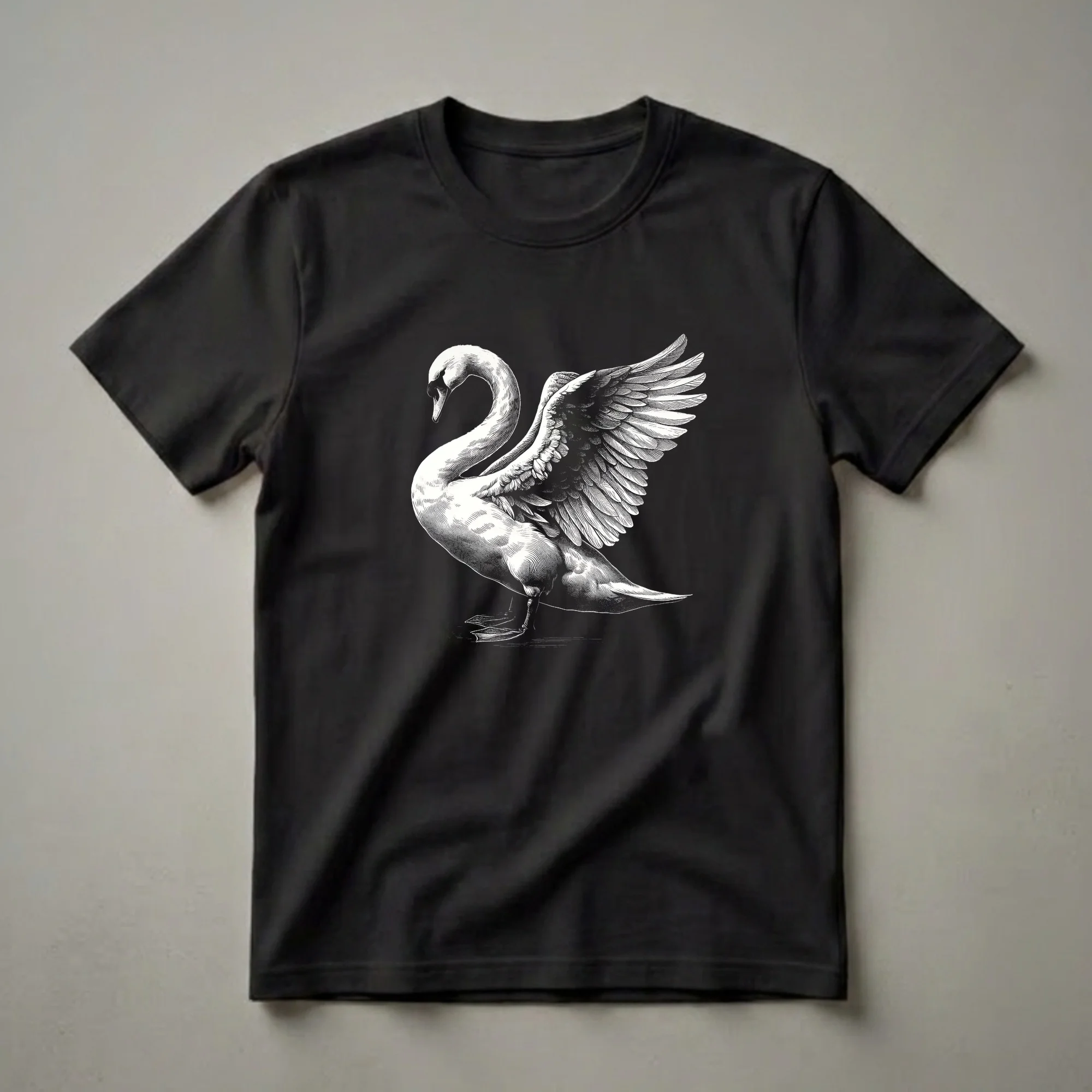 Nature lovers and admirers of fine art will appreciate this striking t-shirt featuring an elegant swan. The design is rendered in a detailed, vintage engraving style, showcasing the swan with its wings gracefully spread. Swans, known for their beauty and symbolic representation of grace, are often found in freshwater habitats like lakes and rivers, where they feed on aquatic vegetation. This graphic tee captures the majestic presence of these birds, making it a standout piece for anyone who cherves the natural world. This shirt works well for birdwatchers, hikers, or anyone who enjoys wildlife art. It makes a thoughtful gift for a friend or family member who has a deep appreciation for the outdoors and the creatures that inhabit it. Wear this unique shirt to your next nature walk or casual outing to express your passion for wildlife.