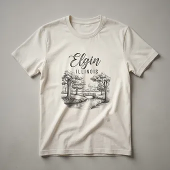 - Graphic t-shirt featuring a sketch of a park scene in Elgin, Illinois.