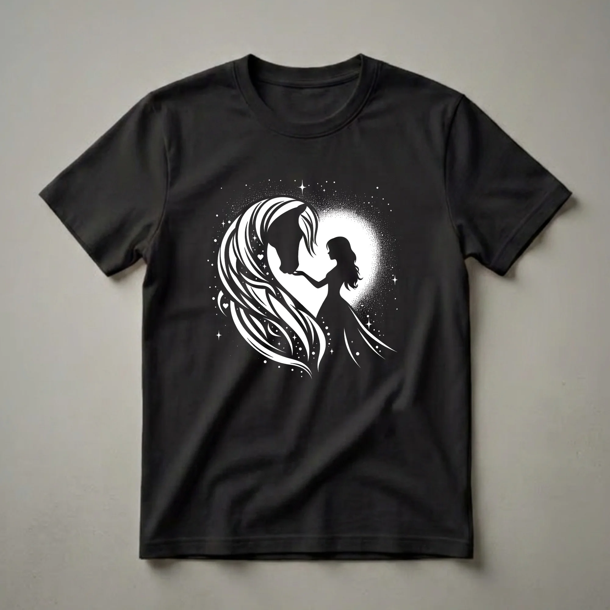 Horse lovers will adore this striking graphic tee, featuring a captivating silhouette of a woman in a flowing gown gently reaching out to a majestic horse. The artwork is set against a backdrop of a speckled, starry night sky, with subtle hints of hearts and sparkling stars woven into the design. This t-shirt is a beautiful representation of the deep bond between humans and these magnificent creatures. Horses, known for their strength, grace, and loyalty, have been companions to humans for thousands of years, playing vital roles in transportation, agriculture, and sport. This shirt is a thoughtful gift for any woman or girl who cherishes these noble animals. Imagine wearing this eye-catching shirt to a local horse show, a casual outing with friends, or simply while relaxing at home. It's a wonderful way to express your passion for all things equine and celebrate the magic of the horse-human connection. This unique design makes a thoughtful gift for birthdays, holidays, or just because for the horse enthusiast in your life.
