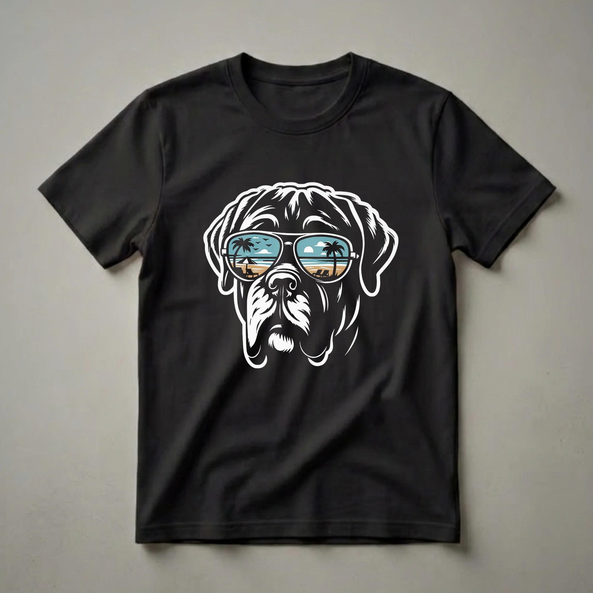 - Features a cool English Mastiff wearing sunglasses with a beach reflection.