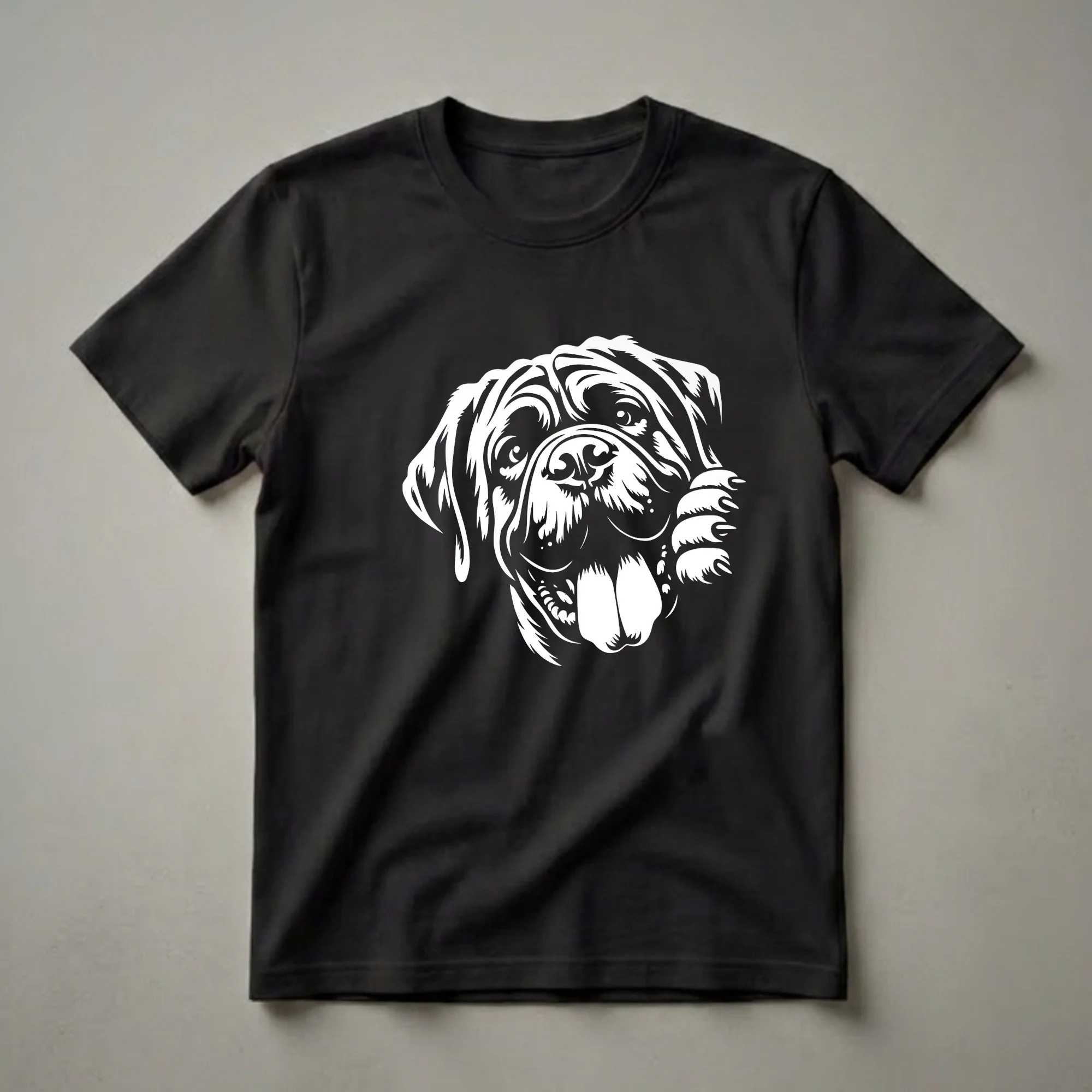 English Mastiff owners know the breed's gentle giant nature and their imposing yet loving presence. This graphic tee captures that spirit with a striking white illustration of an English Mastiff's head peeking into view against a solid background. The detailed linework highlights the breed's characteristic wrinkled face, floppy ears, and broad muzzle, conveying a sense of friendly curiosity. English Mastiffs, originating from ancient Roman Molossers, are known for their calm demeanor and loyalty, making them wonderful family companions. This shirt is a thoughtful gift for any woman who cherishes her Mastiff, whether she's a dedicated dog mom or simply appreciates unique canine art. It's a go-to tee for casual outings, dog park visits, or relaxing at home with your furry friend. The design's bold, graphic style ensures it stands out, making it a conversation starter among fellow dog enthusiasts. Celebrate your bond with this magnificent breed through this eye-catching apparel.