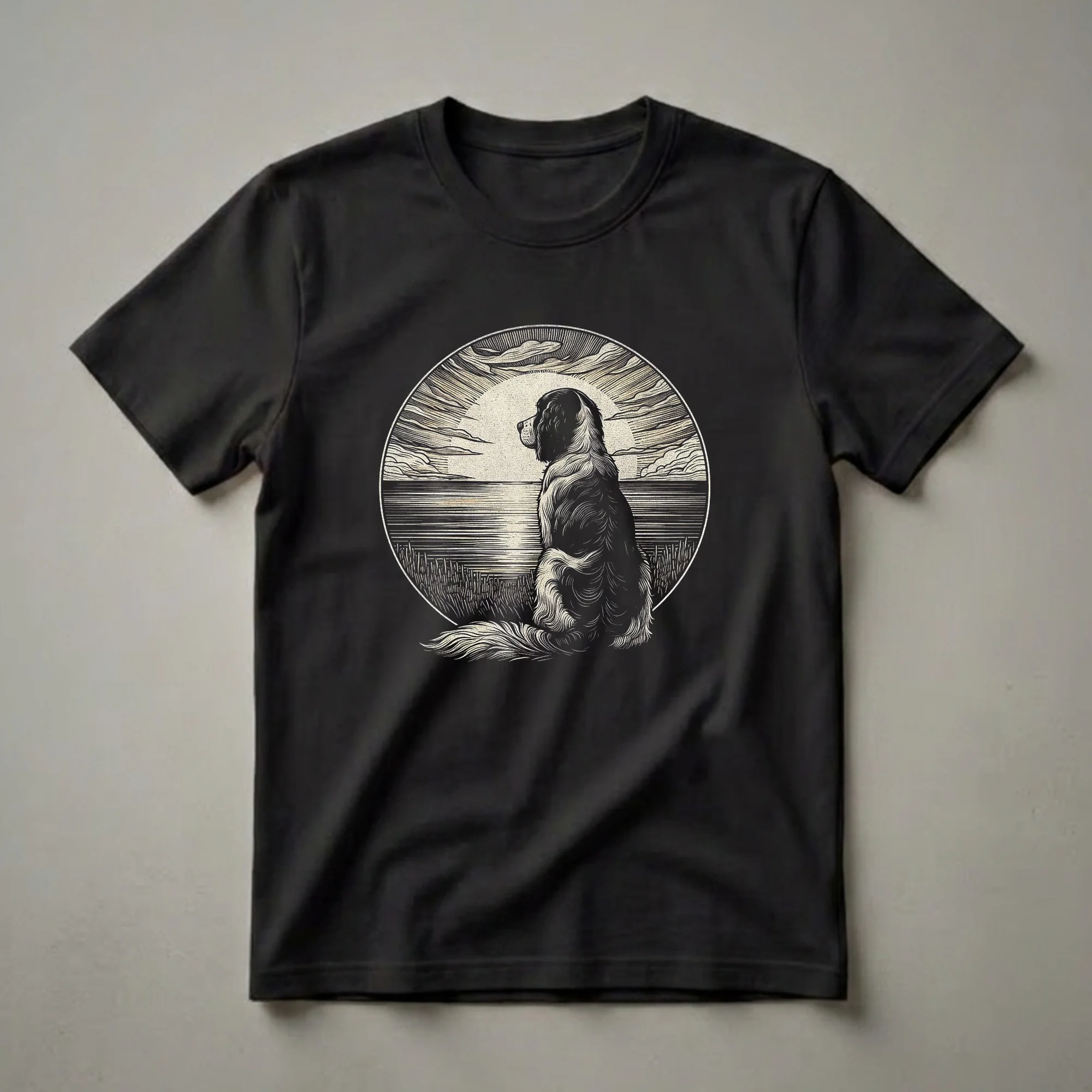English Springer Spaniel owners know the breed's energetic spirit and affectionate nature, often seen with a happy, attentive gaze. This striking graphic tee captures that essence, featuring a beautifully rendered English Springer Spaniel sitting in profile. The dog looks out towards a tranquil lake scene, bathed in the warm glow of a large, stylized sun. Above, dramatic clouds are depicted with bold linework, mirroring the textured fur of the dog and the rippling water below. The entire scene is framed within a circular motif, reminiscent of vintage engravings or woodcut prints, giving it an artistic and timeless appeal. This shirt is a thoughtful gift for any dog mom or dad who adores their Springer Spaniel. It's a perfect way to express your connection to this beloved breed, whether you're heading out for a walk in the park or enjoying a quiet evening at home. The detailed linework and serene composition make this t-shirt a standout piece for any dog enthusiast's wardrobe. Wear it to show off your pride in your furry family member.