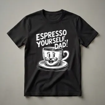 Dads who love their morning coffee will appreciate this humorous graphic tee featuring a vintage-style coffee cup character. The design showcases a steaming cup of coffee, complete with a whimsical face, a prominent mustache, and the playful phrase 'Espresso Yourself, Dad!' emblazoned above. This shirt is a thoughtful gift for any father who enjoys a good cup of coffee and a laugh. Coffee culture is deeply ingrained in daily routines, with espresso being a concentrated form of coffee enjoyed worldwide for its bold flavor and energizing properties. This t-shirt works well for dads who are coffee connoisseurs or simply enjoy a daily caffeine boost. It's a great conversation starter and a fun way for fathers to express their personality. Wear this tee to casual gatherings, weekend brunches, or simply while enjoying a quiet morning with a hot beverage. It makes a thoughtful gift for Father's Day, birthdays, or any occasion where you want to bring a smile to Dad's face. This coffee-themed shirt is a staple for any dad's casual wardrobe.