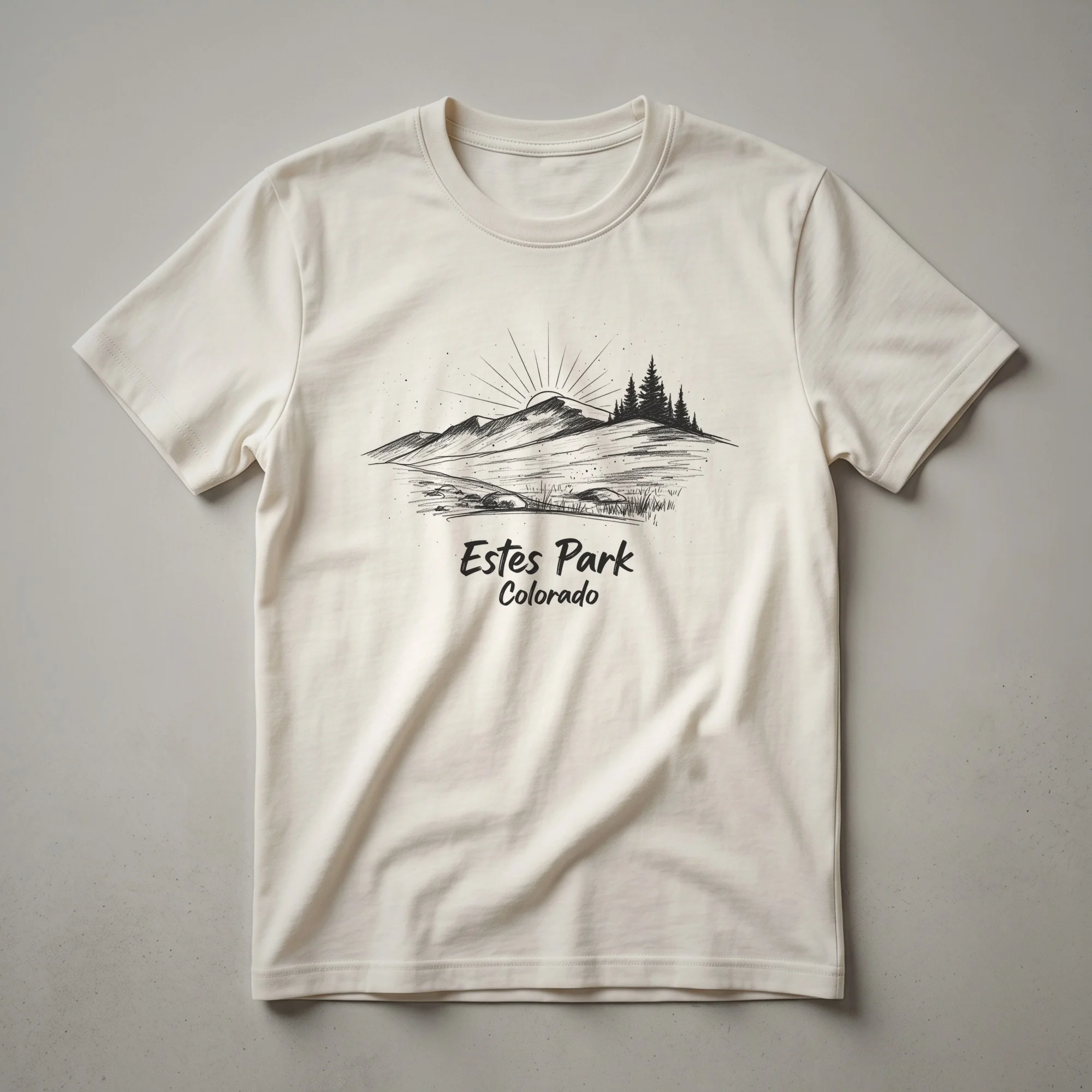 Estes Park, Colorado, is a gateway to the majestic Rocky Mountains, and this sketch-style graphic tee captures its natural splendor. The design features a striking mountain range under a sunburst, with silhouetted pine trees adding to the alpine atmosphere. The words 'Estes Park Colorado' are rendered in a casual, artistic font, making this shirt a wearable memento for anyone who has visited or dreams of visiting this iconic destination. Rocky Mountain National Park, adjacent to Estes Park, is known for its diverse wildlife, including elk and bighorn sheep, and its breathtaking scenic drives like Trail Ridge Road. This t-shirt is a staple for hikers, nature enthusiasts, and travelers seeking to commemorate their adventures in the Colorado wilderness. It makes a thoughtful gift for friends and family who have a connection to this beautiful mountain town. Wear this shirt on your next outdoor excursion or as a reminder of your favorite mountain getaway.