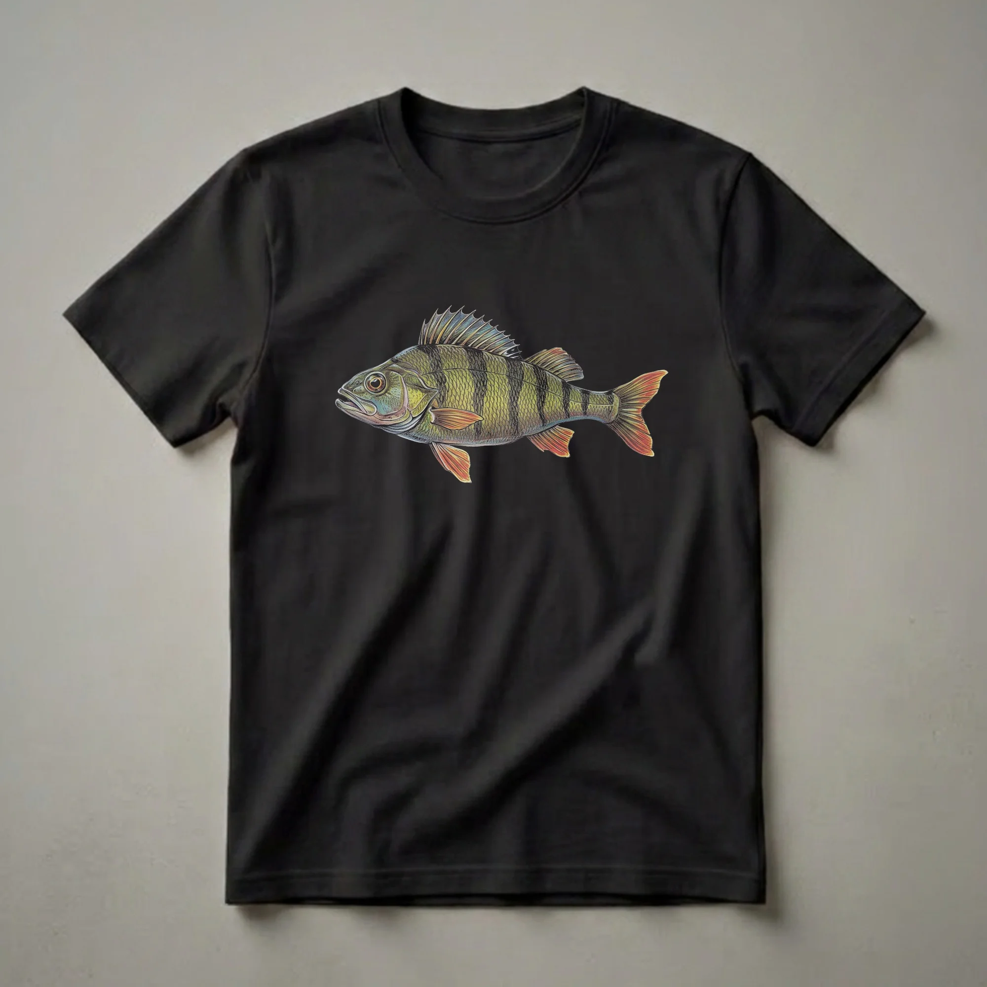 Freshwater anglers who appreciate the beauty of native fish will reach for this striking European Perch t-shirt. The detailed drawing captures the vibrant green and yellow body, accented by bold black vertical stripes and the distinctive red-orange fins of this popular game fish. The European perch, scientifically known as Perca fluviatilis, is a common inhabitant of freshwater lakes and rivers across Europe and parts of Asia, known for its aggressive feeding habits and delicious flesh. This graphic tee is a fantastic way for fishermen to express their passion for the sport, whether they are casting a line in their local waters or dreaming of their next big catch. It makes a thoughtful gift for the fisherman in your life who enjoys the challenge of catching these beautiful specimens. Wear this shirt to your next fishing trip, to a casual outing with friends, or while planning your next angling adventure. This unique shirt celebrates the natural artistry of the European perch, making it a standout piece for any nature lover or dedicated angler.