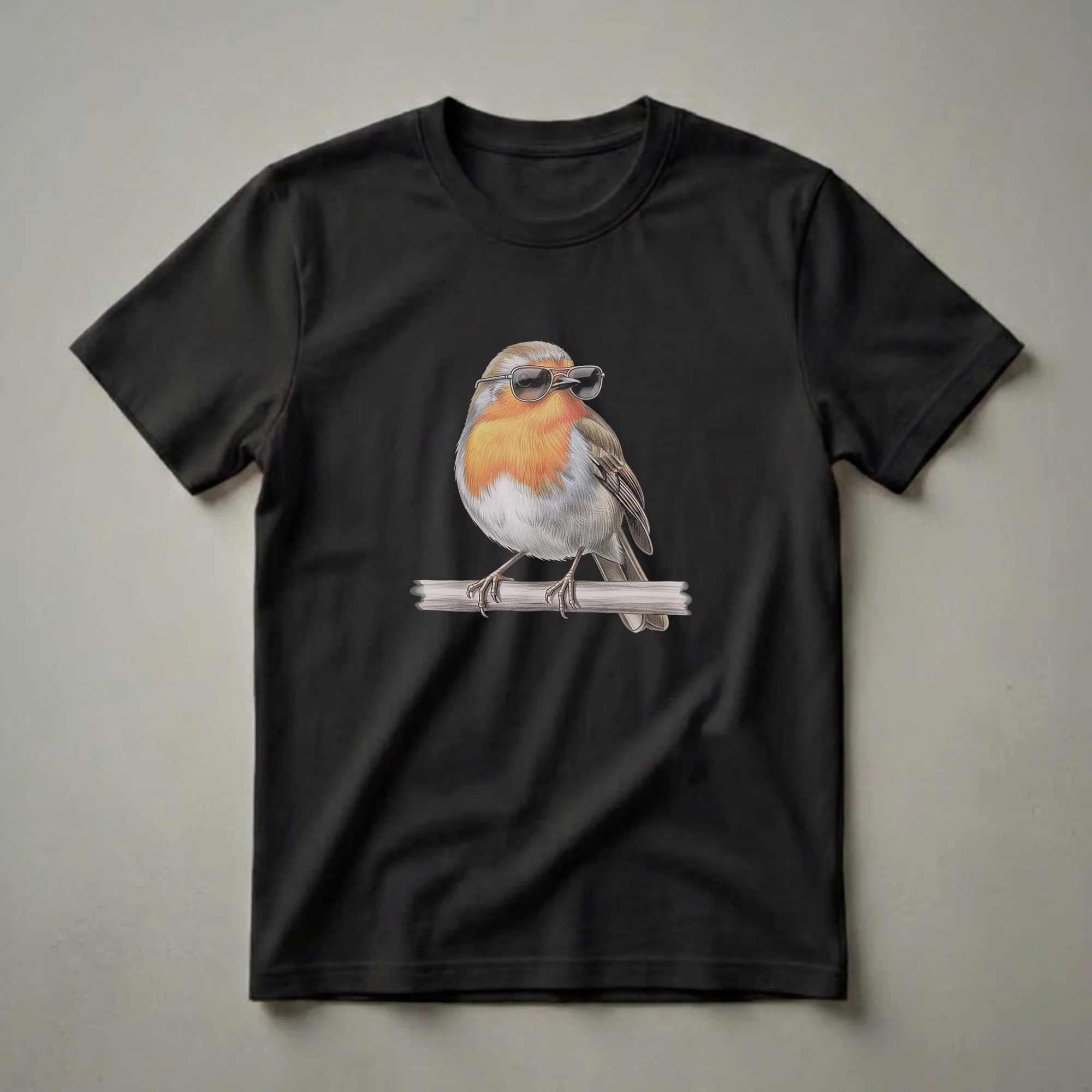 - Features a detailed drawing of a European Robin wearing sunglasses, perfect for bird lovers.