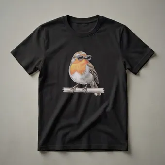 European Robins, known for their distinctive orange-red breasts and cheerful songs, are a common sight across Europe. These small, charming birds are often found in gardens, woodlands, and hedgerows, and are recognized for their bold yet friendly demeanor. This eye-catching graphic tee features a beautifully rendered drawing of a European Robin perched confidently on a branch, sporting a pair of stylish aviator sunglasses. The detailed artwork captures the bird's characteristic plumage, from its warm orange chest to its grey and brown wings, all rendered with a vintage, hand-drawn aesthetic. This shirt is a fantastic way for birdwatchers, nature enthusiasts, or anyone who appreciates unique wildlife art to express their passion. It makes a thoughtful gift for friends or family who adore birds or are looking for a distinctive piece of apparel. Wear this robin shirt to your next birdwatching excursion, a casual outing, or simply to add a touch of personality to your everyday wardrobe.