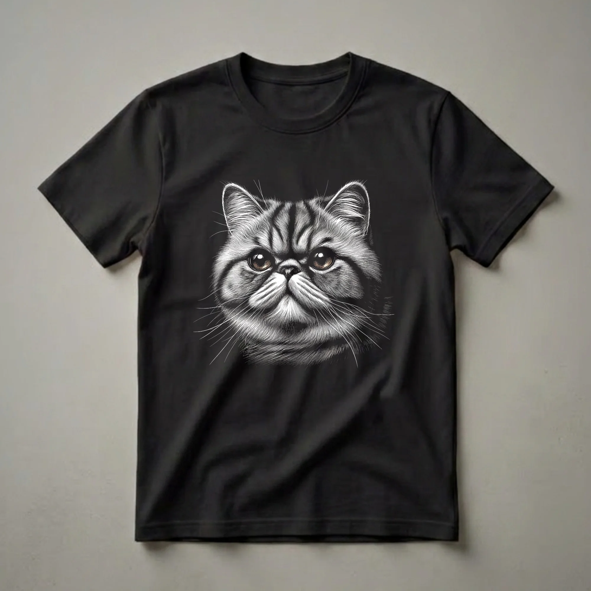 Cat moms and cat dads who appreciate the unique charm of the Exotic Shorthair breed will reach for this eye-catching graphic tee. The design features a detailed, vintage-style scratchboard illustration of an Exotic Shorthair cat's face, complete with its distinctive flat face, large round eyes, and luxurious fur texture rendered in striking black and white lines. Exotic Shorthairs are known for their laid-back personality and playful nature, making them a beloved companion animal. This shirt captures the breed's gentle expression and distinctive features with artistic flair. It's a thoughtful gift for anyone who adores these cuddly felines, a thoughtful choice for casual outings, game nights, or simply lounging at home. Wear this t-shirt to express your affection for your feline friend and spark conversations with fellow cat enthusiasts.