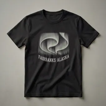 This graphic t-shirt showcases a captivating depiction of the aurora borealis dancing across a starry night sky. The vibrant, swirling lights are rendered in a sketch-like style, evoking the ethereal beauty of the Northern Lights. Below the celestial display, a dense silhouette of pine trees stretches across the horizon, representing the rugged Alaskan wilderness. Arching above the trees, the words "FAIRBANKS ALASKA" are emblazoned in a distressed, vintage-style font, anchoring the design to its namesake city. Fairbanks is renowned as one of the premier locations in the world to witness the aurora borealis, with its clear skies and northern latitude offering frequent and spectacular displays. This shirt is a wonderful way for anyone who has experienced the magic of Fairbanks or dreams of seeing the Northern Lights to express their connection to this incredible natural phenomenon. It makes a thoughtful gift for Alaskans, travelers, or anyone captivated by the wild beauty of the Last Frontier. Wear this tee to celebrate your Alaskan adventures or to inspire your next journey north.