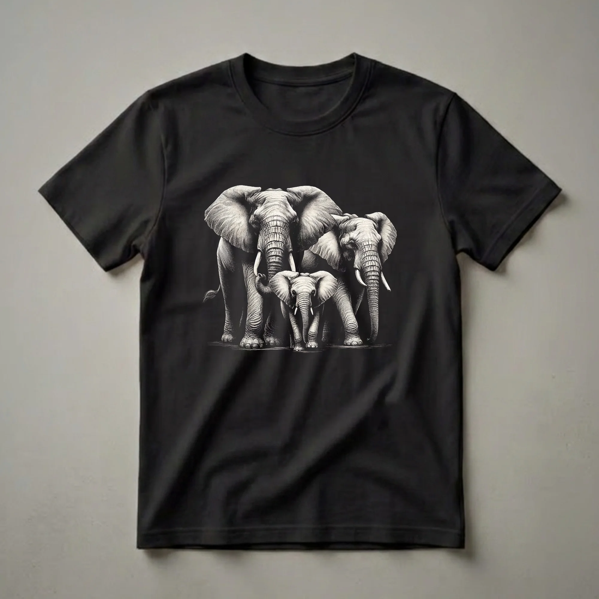 Elephant families are known for their strong social bonds and matriarchal structures, with herds often led by the oldest and largest female. This striking graphic tee captures the essence of that connection, featuring a detailed, black and white sketch of two adult elephants and a calf standing together. The art style, reminiscent of classic etchings, highlights the intricate textures of their skin and the gentle power of these magnificent creatures. African elephants, the largest land mammals on Earth, inhabit a variety of habitats across the continent, from savannas to forests. This t-shirt is a wonderful way for any child who adores these gentle giants to express their passion. It makes a thoughtful gift for a birthday or any occasion for the young animal lover in your life. Imagine them wearing this unique shirt to the zoo or on a nature walk, sparking conversations about wildlife and conservation. This shirt is a staple for any young explorer's wardrobe.