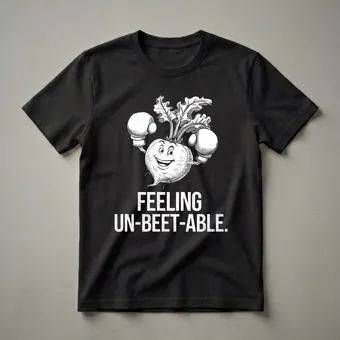 Gym-goers and fitness enthusiasts who appreciate a good pun will reach for this eye-catching tee. The design features a whimsical, anthropomorphic beet character, rendered in a classic black and white illustration style. This beet is ready to rumble, sporting a pair of boxing gloves and a confident, wide grin. Above the character, bold, distressed white lettering proclaims, "FEELING UN-BEET-ABLE." This shirt is a playful nod to the power of vegetables in a healthy diet, and the determination required for a solid workout. Beets themselves are known for their earthy flavor and vibrant color, and are packed with nutrients that support stamina and recovery, making them a staple for many athletes. This t-shirt works well for anyone who loves to hit the gym, participate in sports, or simply enjoys a healthy lifestyle with a sense of humor. It makes a thoughtful gift for the vegan athlete in your life or for a friend who is celebrating a fitness milestone. Wear it to your next workout session or casual outing to spark conversations and share a laugh.