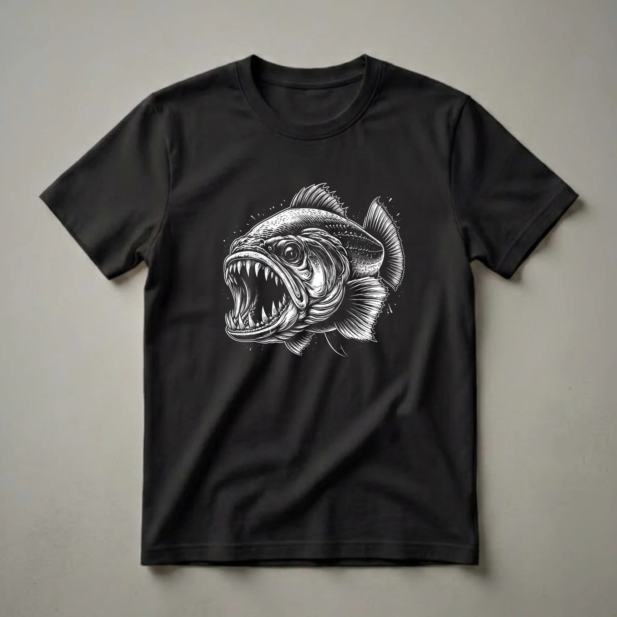 Anglers and freshwater fish enthusiasts who appreciate bold, detailed illustration will reach for this graphic tee. The design features a large, close-up portrait of a piranha with its jaw fully open, revealing multiple rows of sharp, triangular teeth. The artwork is rendered in a detailed engraving style using black and white, with meticulous linework across the fish's body that captures the texture of its scales, the raised dorsal fin, and the menacing set of its jaw. The composition fills the shirt with impact, the piranha's wide eye and gaping mouth creating an immediately striking image against the black background. Piranhas are freshwater fish of the order Characiformes, native to the rivers and floodplain lakes of South America, with the greatest diversity found in the Amazon Basin. The red-bellied piranha (Pygocentrus nattereri) is the most well-known species, reaching up to 12 inches and known for its powerful bite force relative to its body size, among the highest of any fish. Despite their fearsome reputation, piranhas are primarily scavengers and opportunistic feeders that play an important ecological role in their native river systems. Fishing for piranhas is a popular activity in the Amazon region, and piranha teeth have been used by indigenous peoples as cutting tools and weapons for centuries. This shirt is a thoughtful gift for the fisherman in your life, a South American wildlife enthusiast, or anyone captivated by the raw biology of freshwater predators. Wear this tee on a fishing trip, to a casual outing, or any time you want to display your respect for one of the river's most formidable inhabitants.