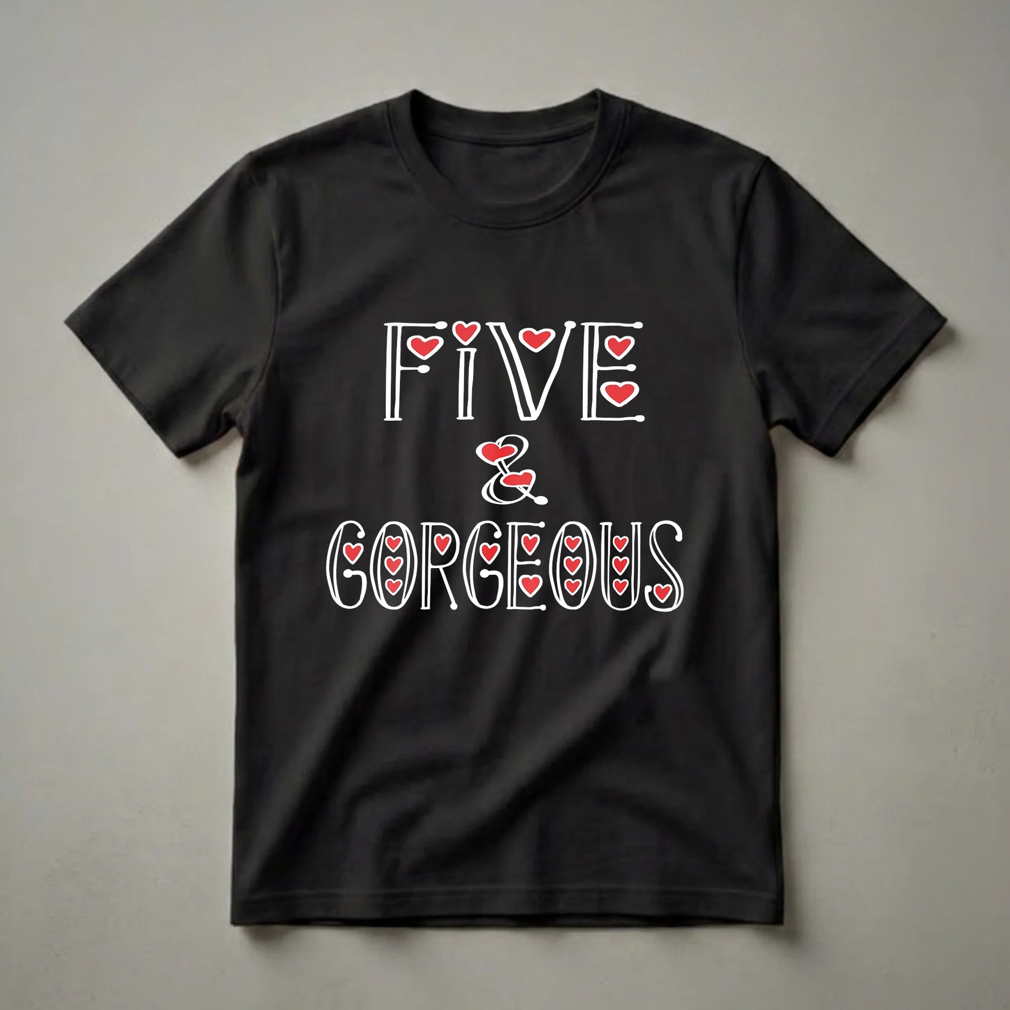 - Features "FIVE & GORGEOUS" in bold white lettering with playful red heart accents to celebrate a 5th birthday.